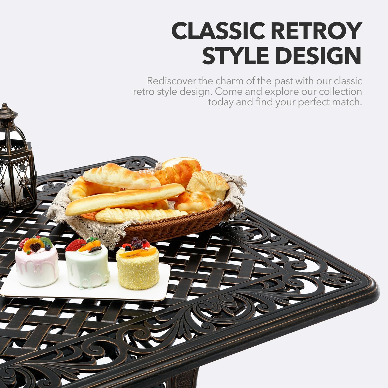 - [BUILT-TO-LAST CAST ALUMINUM] The cast aluminum all-weather patio dining table retains its elegant appearance even after years of age. Our outdoor dining table have been treated with a surface powder coating process, which is rust-resistant, weather-resistant, fade-resistant, and chip-resistant. The aluminum patio table features an oil-rubbed bronze finish for a timeless look that is designed to withstand the elements year-round.