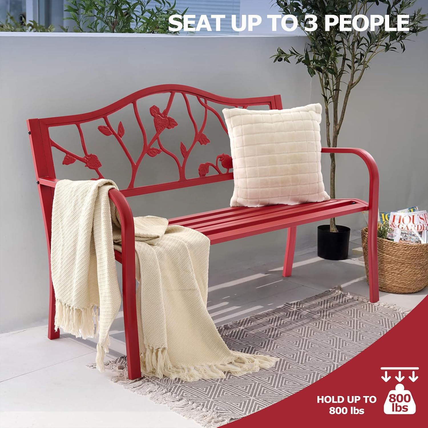 50” Strawberry Outdoor Garden Bench, Weatherproof Sturdy Cast Iron Metal Frame Patio Park Bench for Porch Yard Lawn Deck Park (Red Strawberry Style)