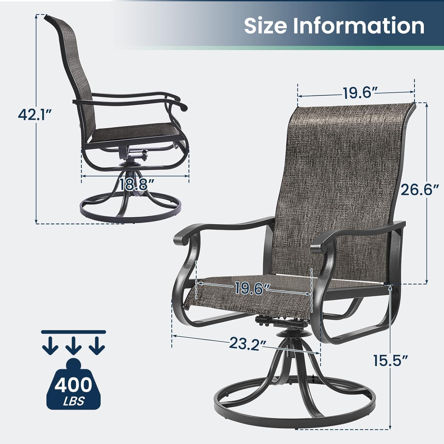 - 【360°SWIVEL & 15°ROCKING DINING CHAIRS】With a smooth 360° swivel and a slight 15° rocking motion, these outdoor dining chairs offers great flexibility and comfort for relaxing and enjoying time outdoors with family and friends, even after long hours of sitting!