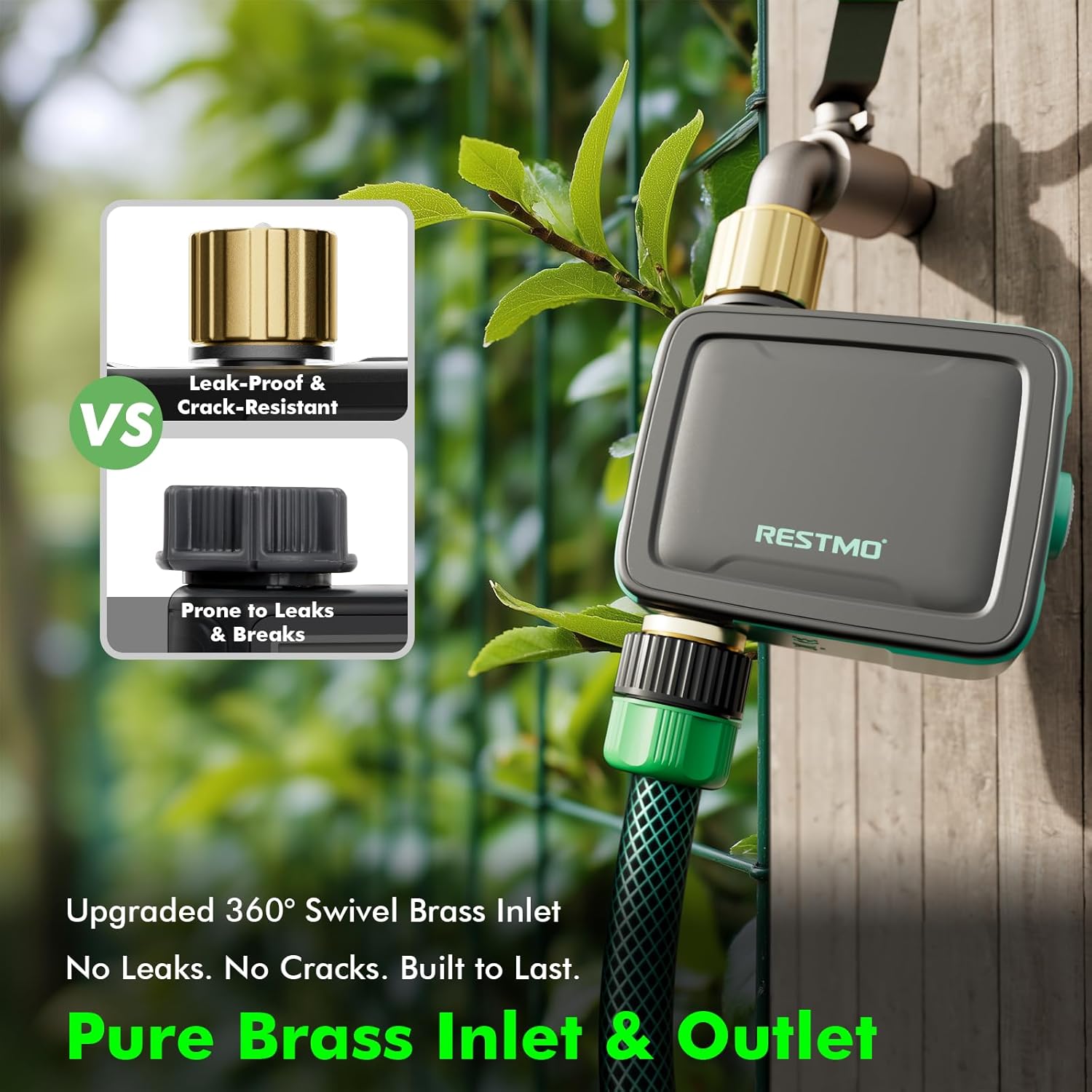 RESTMO Smart Sprinkler Timer with Flow Meter, Water Timer for Garden Hose, Brass Inlet & Outlet, Automatic Lawn & Yard Irrigation Watering System, APP Remote Control (RF Hub + WiFi Connection)