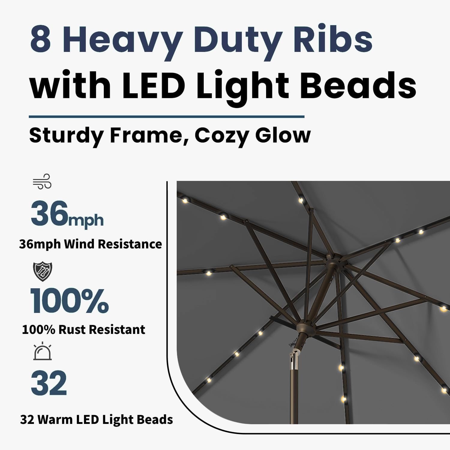 9FT Solar Umbrella 32 LED Lighted Patio Umbrella Table Market Umbrella w/Tilt and Crank, UV-Resistant Outdoor Umbrella for Pool, Garden, Deck, Gray