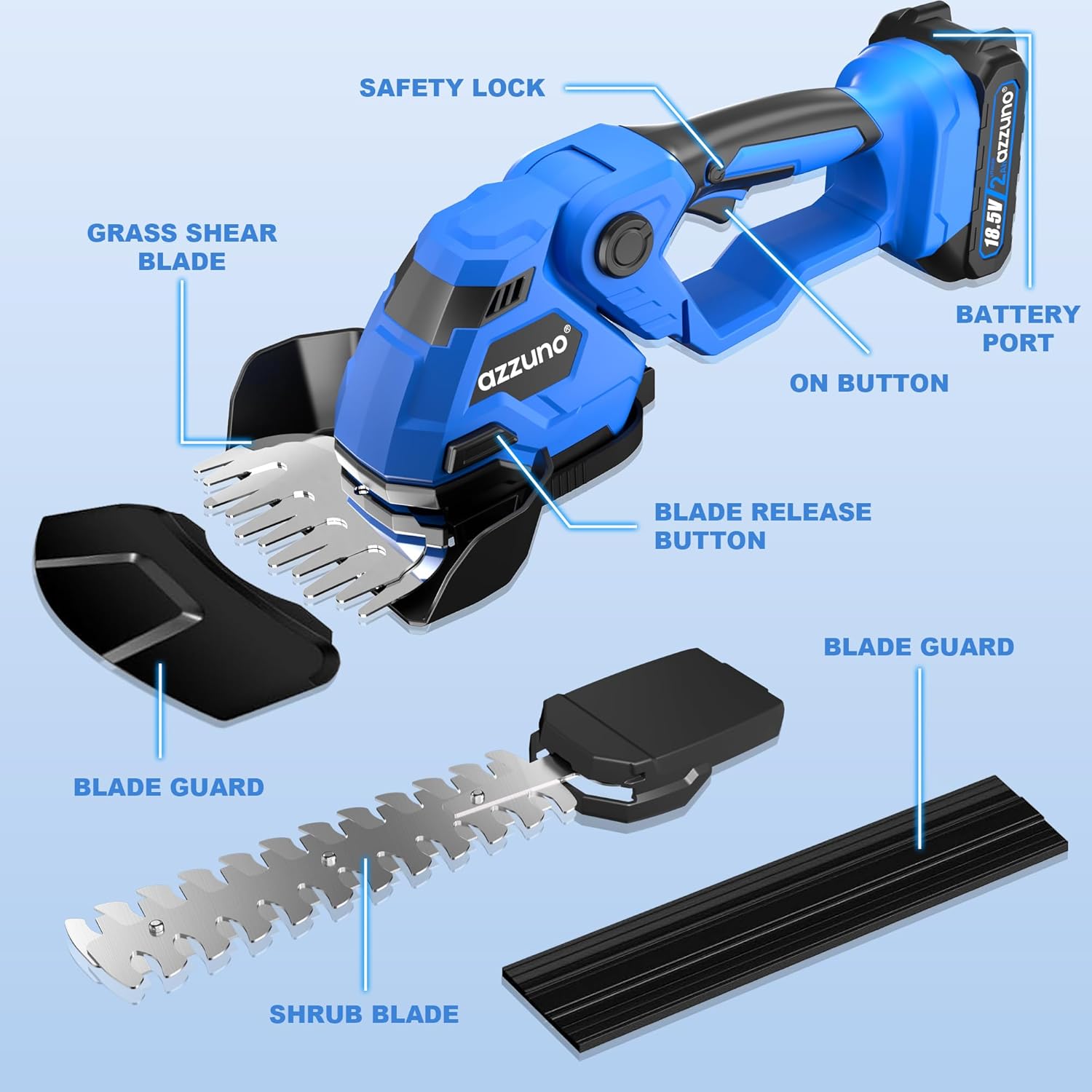 AZZUNO Cordless Hedge Trimmer, 2-in-1 Electric Grass Shears Shrubbery Trimmer with 2Ah Battery,Handheld Grass Cutter Shrub Trimmer for Gardens, Yards, Lawns, Including Charger(2 Batteries)