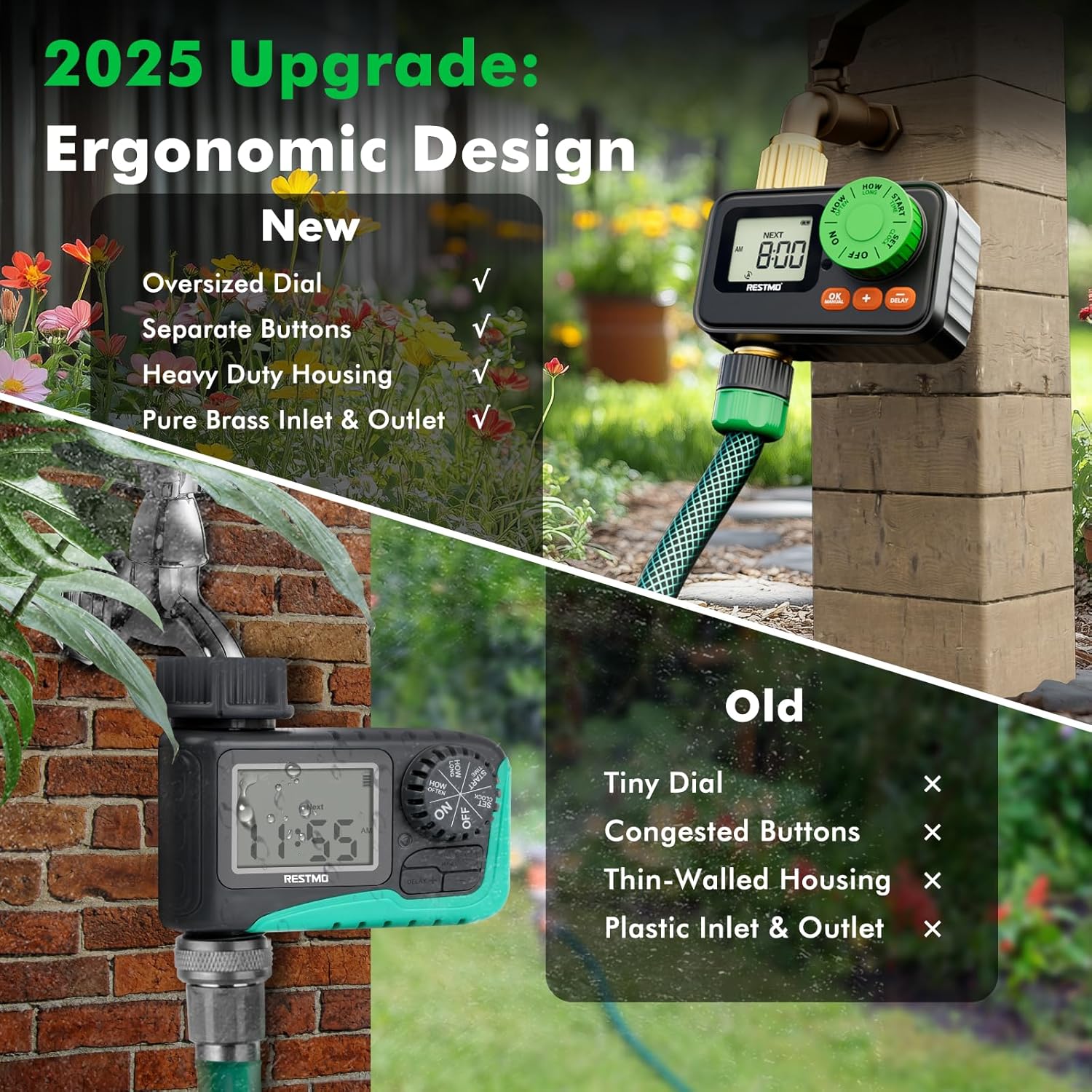 - 【Built for Outdoor Use】Designed with IP55 waterproof protection and leakproof construction, this timer is perfect for various outdoor watering applications, including garden hose irrigation, lawn sprinklers, greenhouse misting, pool filling, birdbaths, rain barrels, and even pet water dispensers.