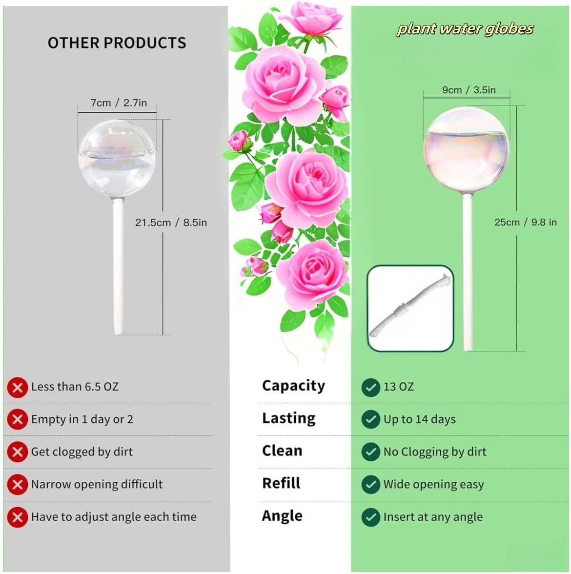 - Large Plant Watering Globes: Keep your plants hydrated for up to 2 weeks with a large 13 oz capacity, perfect for larger plants. Recommend for 4 inch and above potted plants.