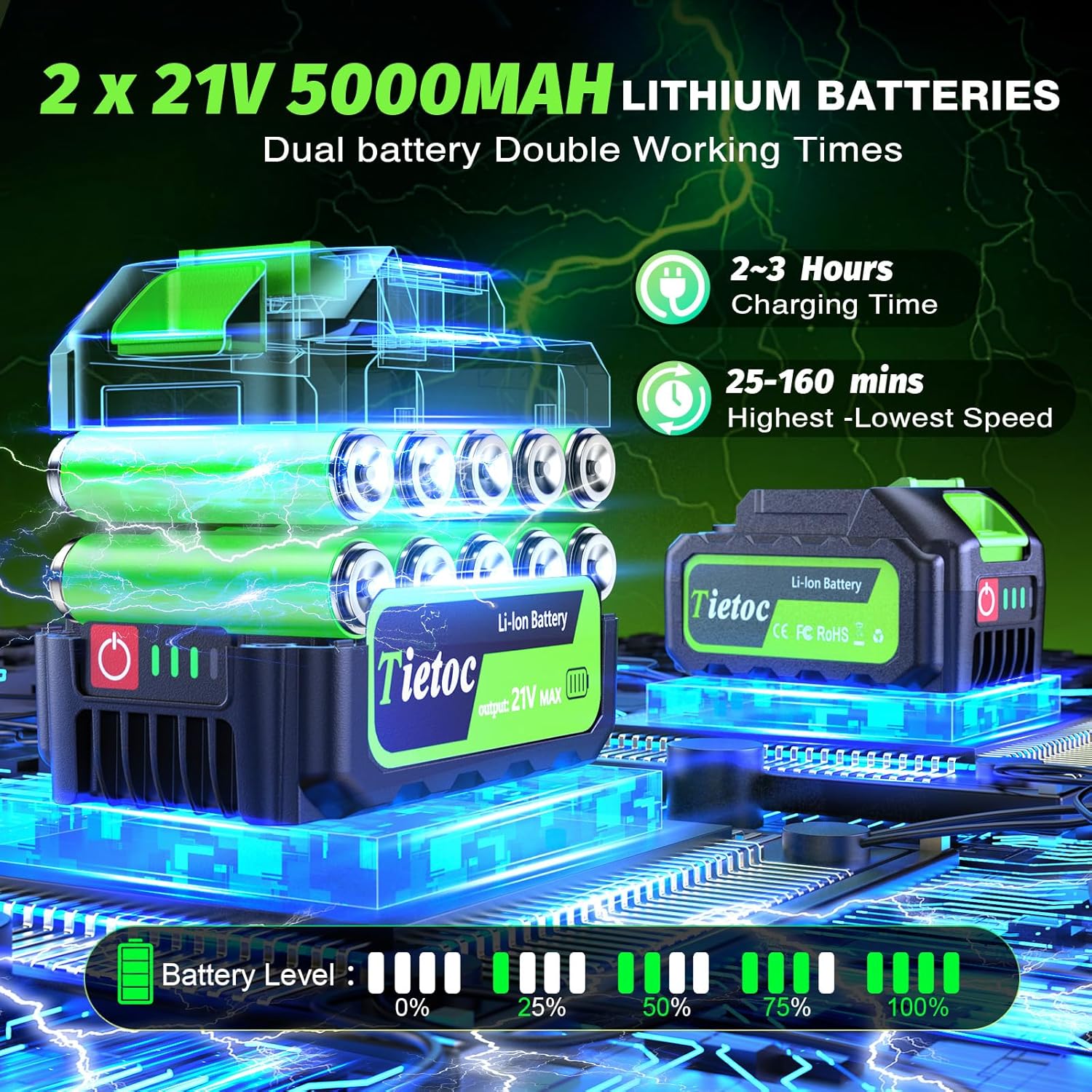 - 𝐆𝐫𝐞𝐚𝐭 𝐈𝐝𝐞𝐚 𝐟𝐨𝐫 𝐆𝐢𝐟𝐭𝐢𝐧𝐠: Tietoc leaf blowers for lawn care packaged includes: 1x leaf blower body, 2x extension blowpipes, nozzles, 2×21V 5.0Ah batteries, 1x charger, 1x manual. 1x Exquisite packaging box. Exquisite high-quality gift box packaging suitable for both gifting and personal use. Whether it's holiday gifts, gratitude from family and friends, or rewarding oneself, all demonstrate sincerity and quality.