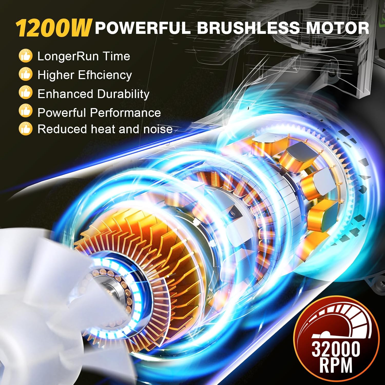 - 𝟑𝟐𝟎𝟎𝟎𝐑𝐏𝐌 𝐏𝐨𝐰𝐞𝐫𝐟𝐮𝐥 𝐁𝐫𝐮𝐬𝐡𝐥𝐞𝐬𝐬 𝐌𝐨𝐭𝐨𝐫: Tietoc cordless leaf blower featuring an advanced brushless motor with a speed of up to 32000RPM, a maximum air volume of 735CFM, a maximum wind speed of 200MPH, it easily blows away fallen leaves, stubborn snow, and deep crevice dust, with a higher cleaning efficiency! In long-term high-intensity work, brushless motors can easily maintain low-temperature stable operation and have a longer working life!