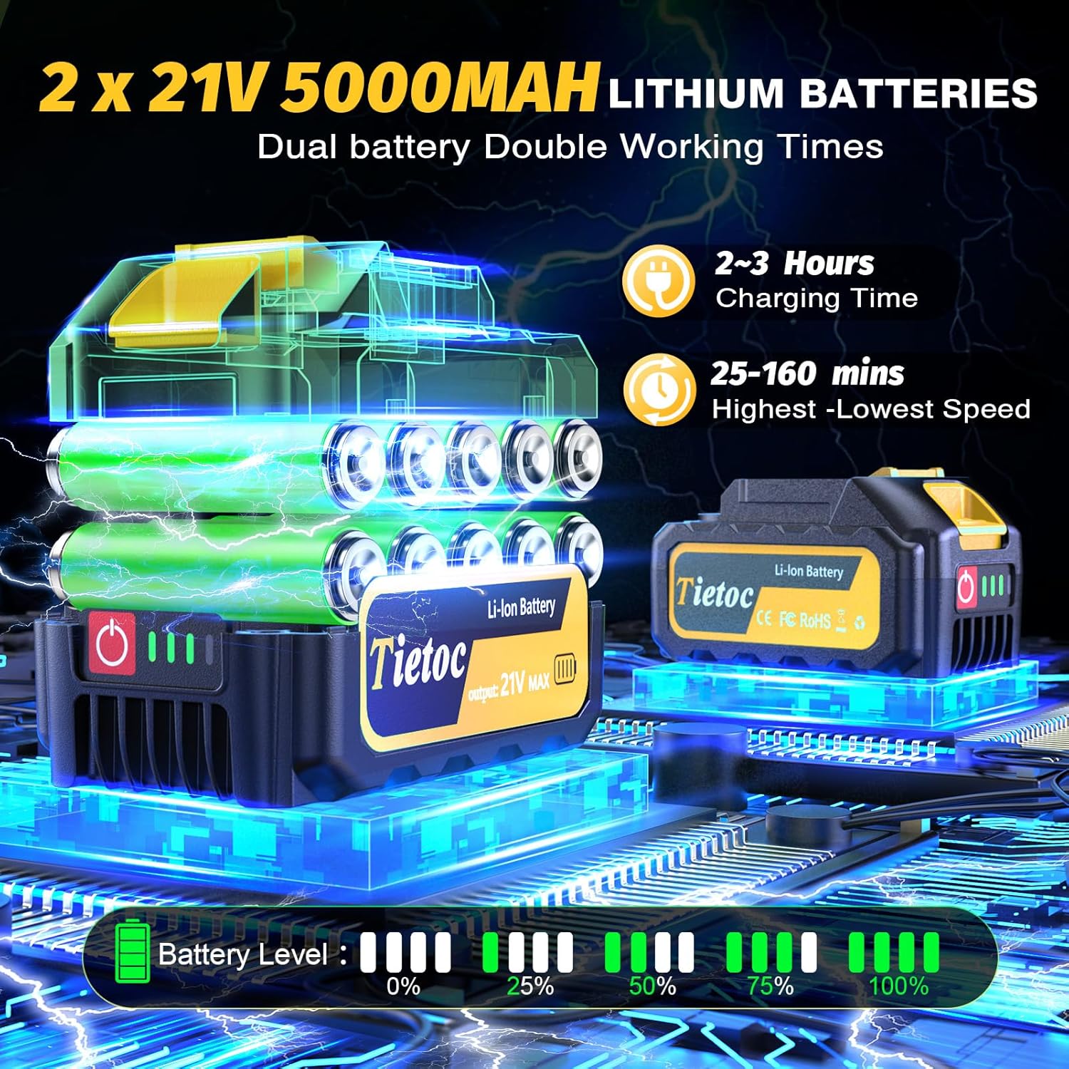 - 𝐆𝐫𝐞𝐚𝐭 𝐈𝐝𝐞𝐚 𝐟𝐨𝐫 𝐆𝐢𝐟𝐭𝐢𝐧𝐠: Tietoc leaf blowers for lawn care packaged includes: 1x leaf blower body, 2x extension blowpipes, nozzles, 2×21V 5.0Ah batteries, 1x charger, 1x manual. 1x Exquisite packaging box. Exquisite high-quality gift box packaging suitable for both gifting and personal use. Whether it's holiday gifts, gratitude from family and friends, or rewarding oneself, all demonstrate sincerity and quality.