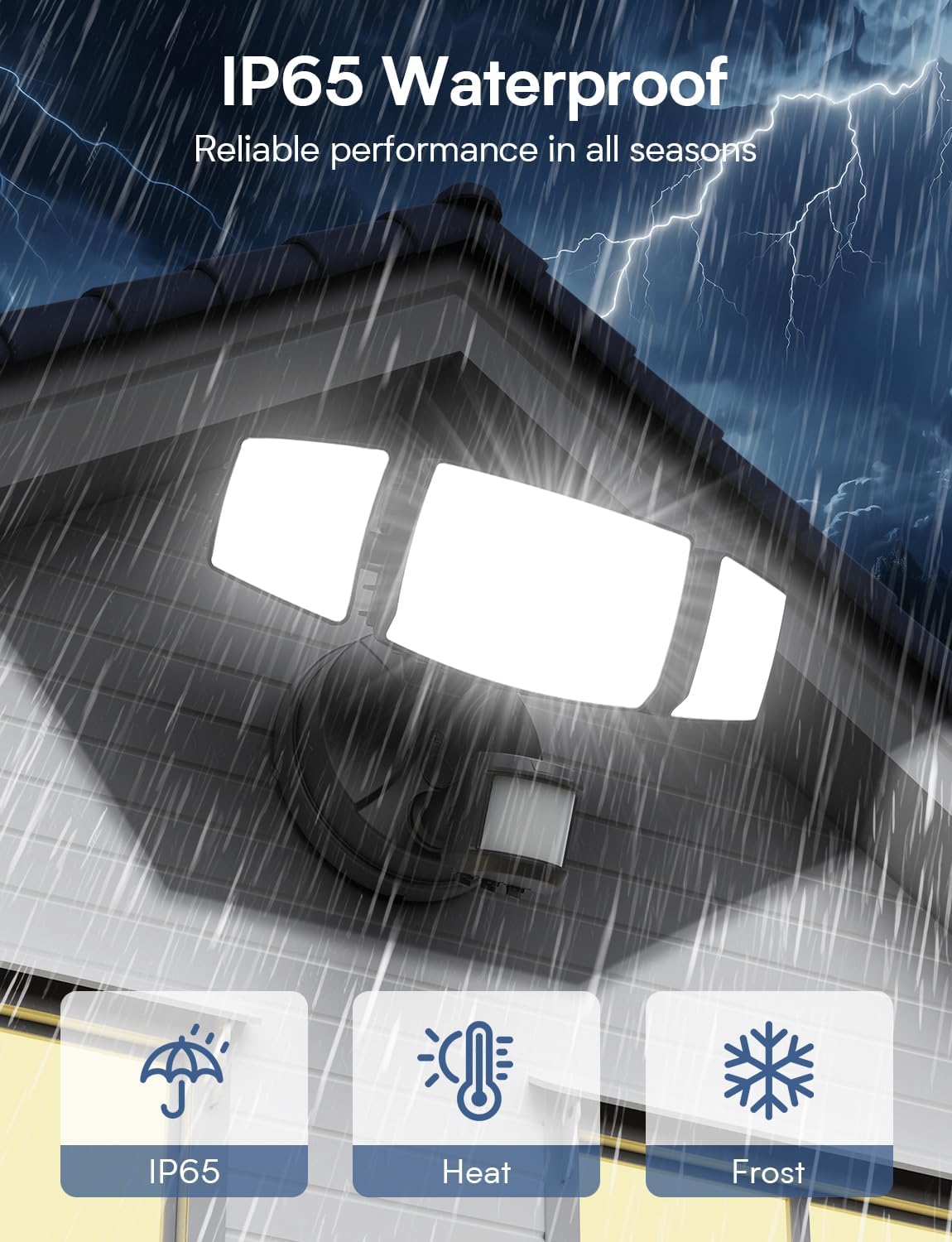 - Built to Last: With an IP65 waterproof rating, this hardwired motion detected light withstand any weather – rain, snow, extreme temperatures, ensuring reliable performance year-round.