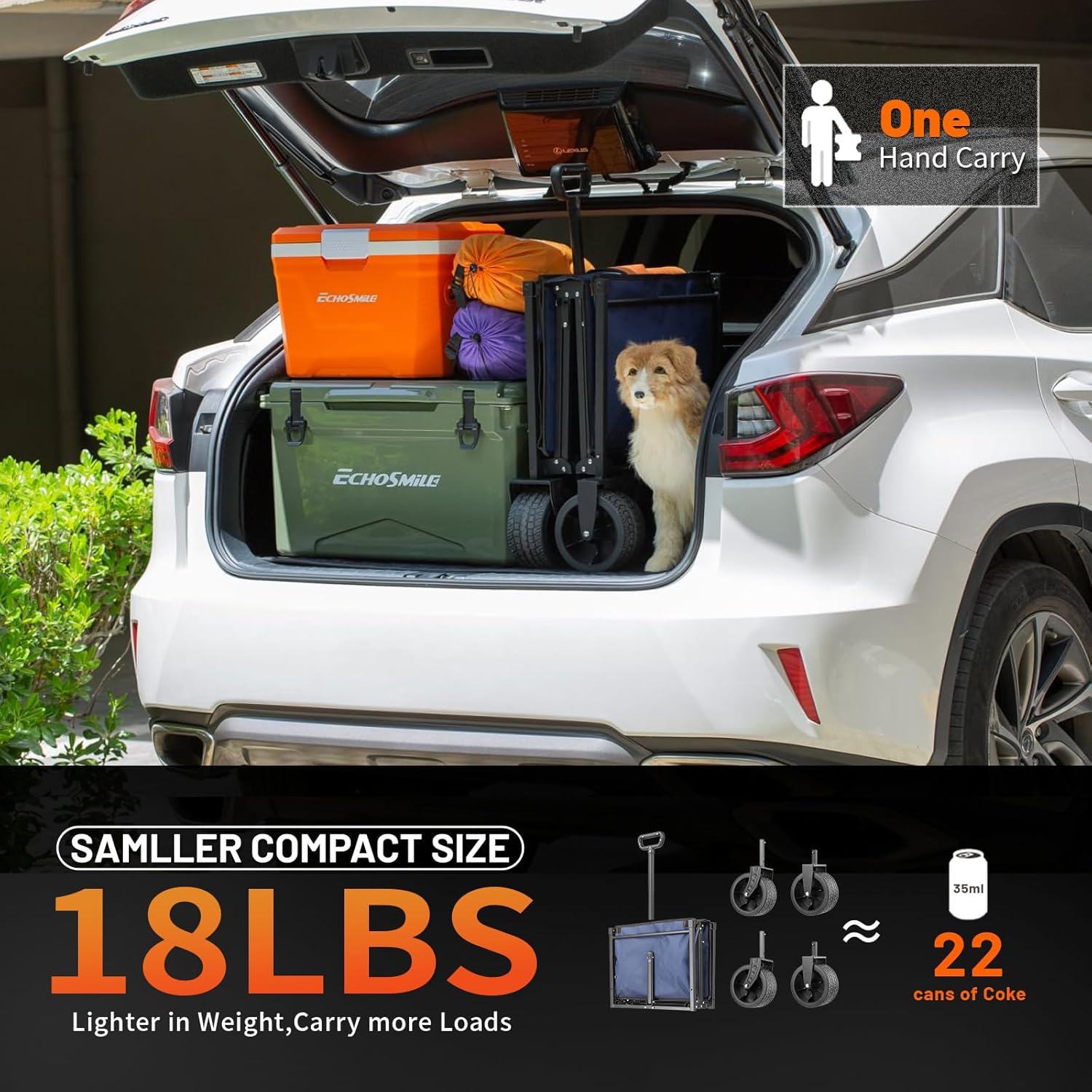 - 【EASY TO FOLD & CARRY】With our innovative fold-flat design, it can be easily folded or unfolded in seconds without the need for any tools.Weighing in at only 18 lbs, folded dimensions: 14“ x 32” x 23”.The EchoSmile collapsible wagon is easy to carry around, or can be easily stored in the trunk of your car, closet, pantry or garage. It comes with a built-in handle, making it easy to take with you wherever you go.
