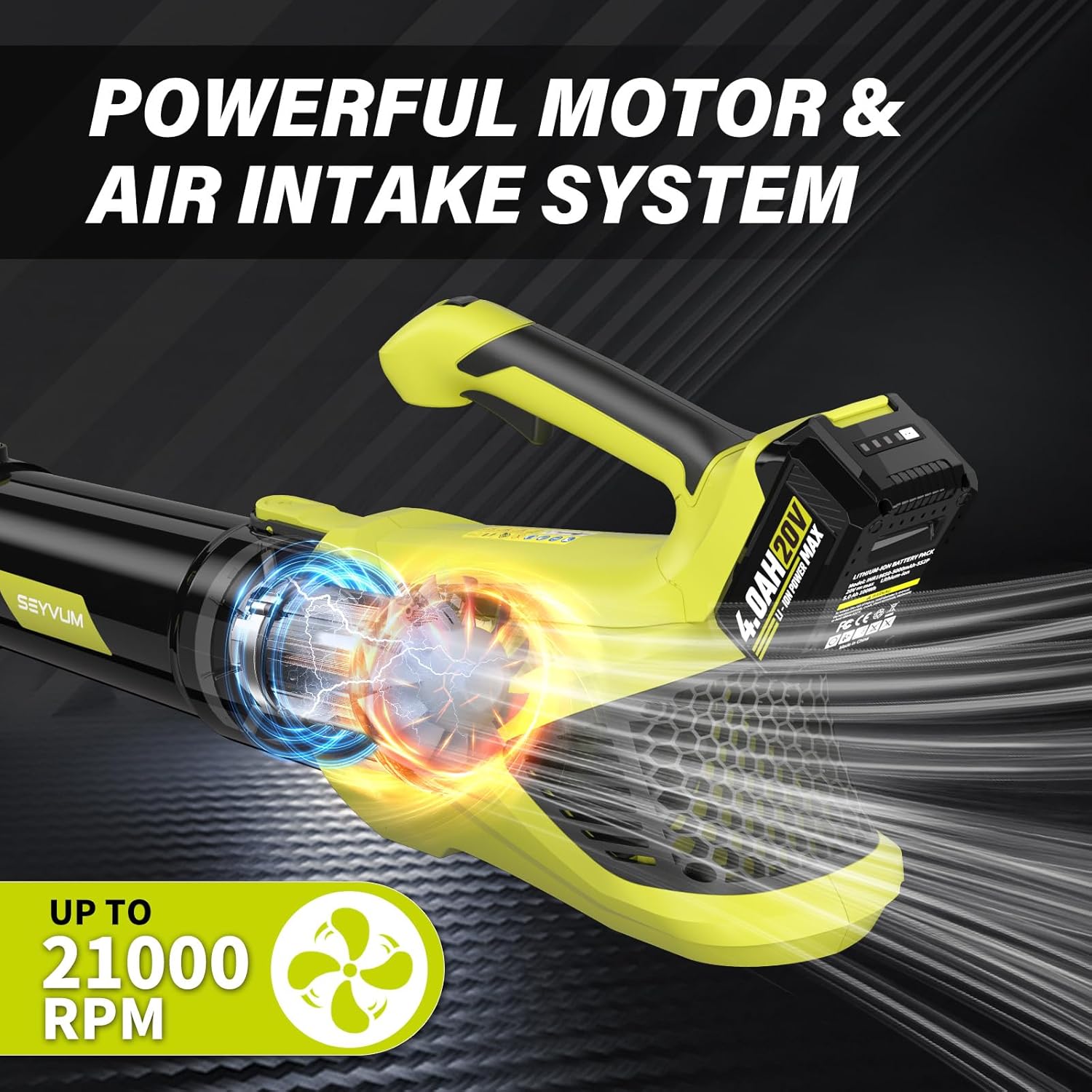 - Powerful Leaf Blower: SEYVUM leaf blower cordless has a high-quality pure copper motor which provides a longer lifespan and lower energy consumption than ordinary motors. It adopts axial flow fan technology with faster rotation speed, air volume more power and better heat dissipation than traditional centrifugal fans