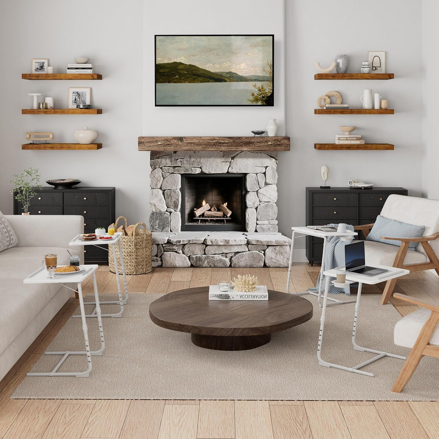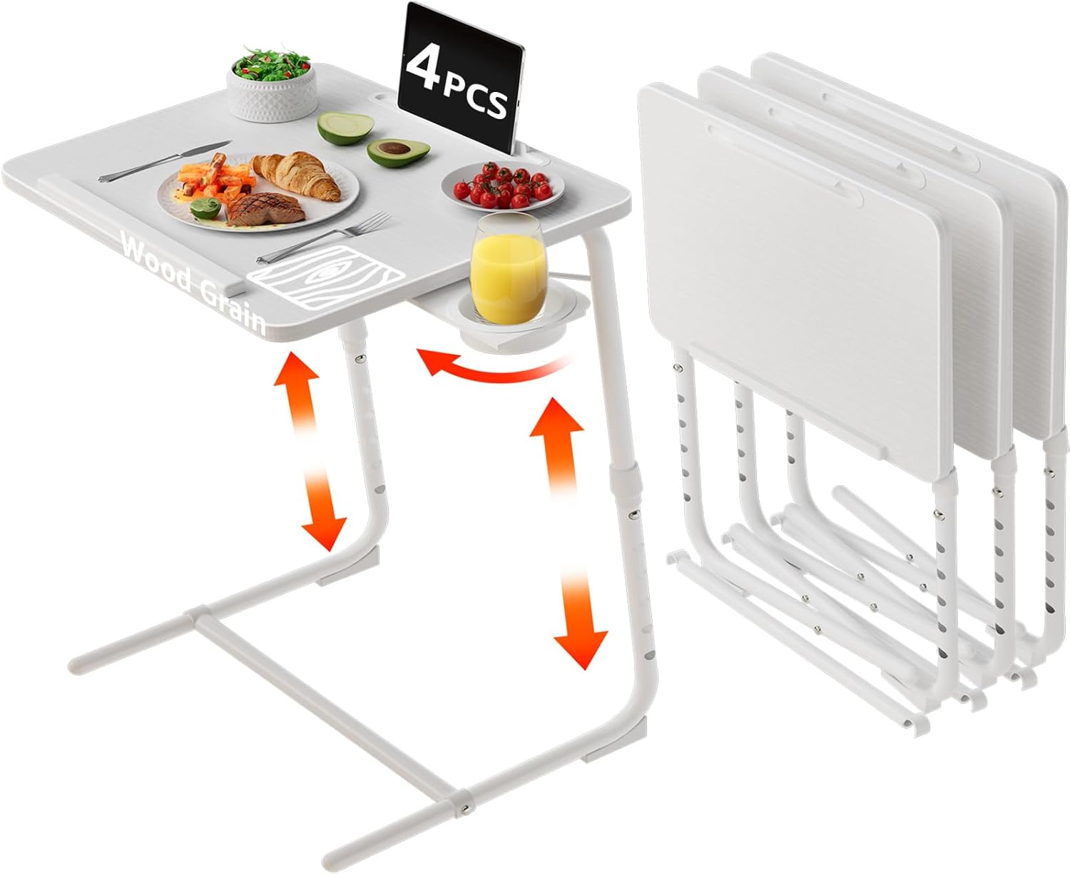TV Trays Set of 4 - Folding TV Tray Adjustable Dinner Trays for Eating On Couch Wooden Tables Mate Stand Foldable White Desk with Cup Holder Portable