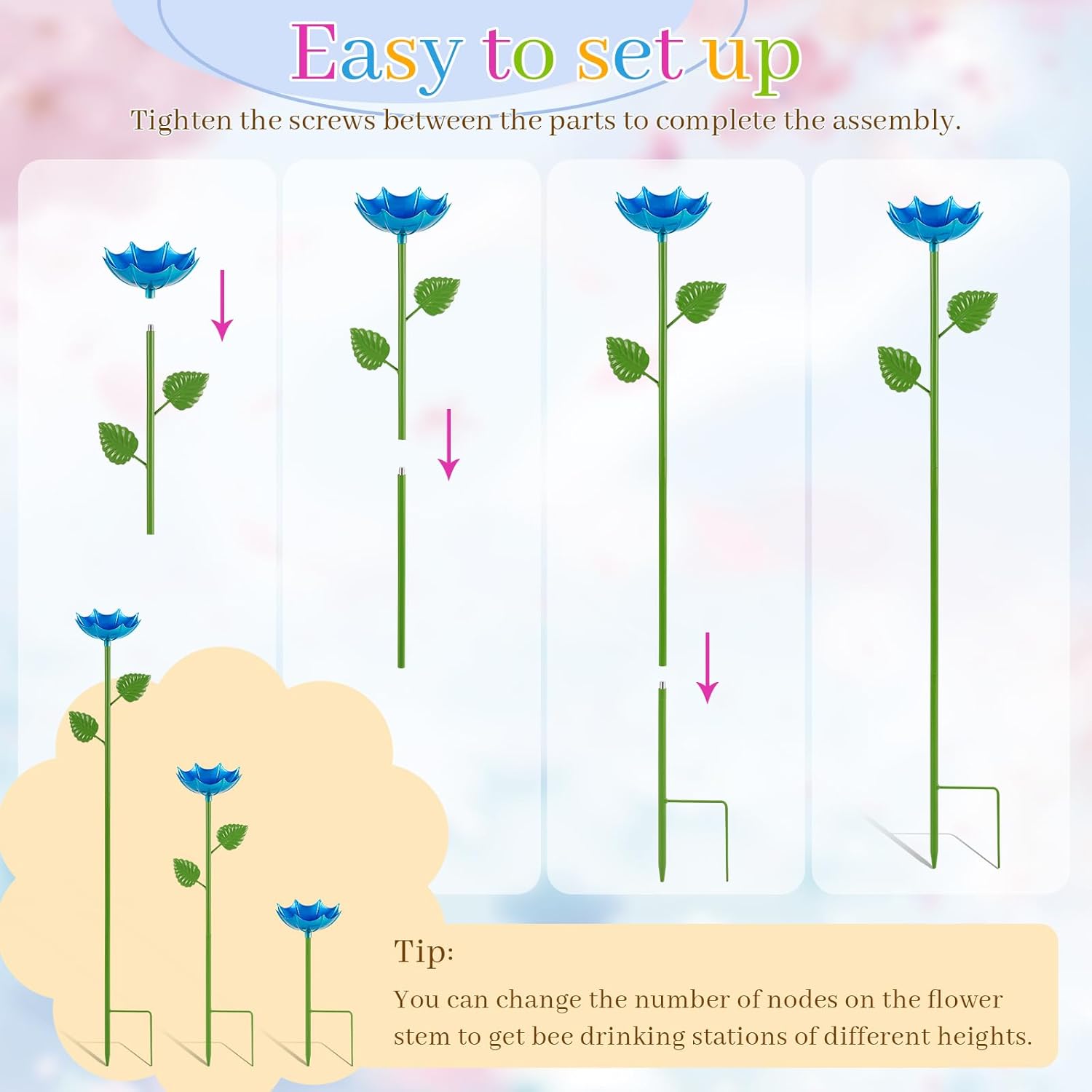 - Quick installation: The pollinator garden bee waterer does not require installation tools, and can be assembled by directly tightening the screws. In addition, the height can be adjusted by changing the number of rod diameters to form the bee and butterfly water station sponge with different heights.
