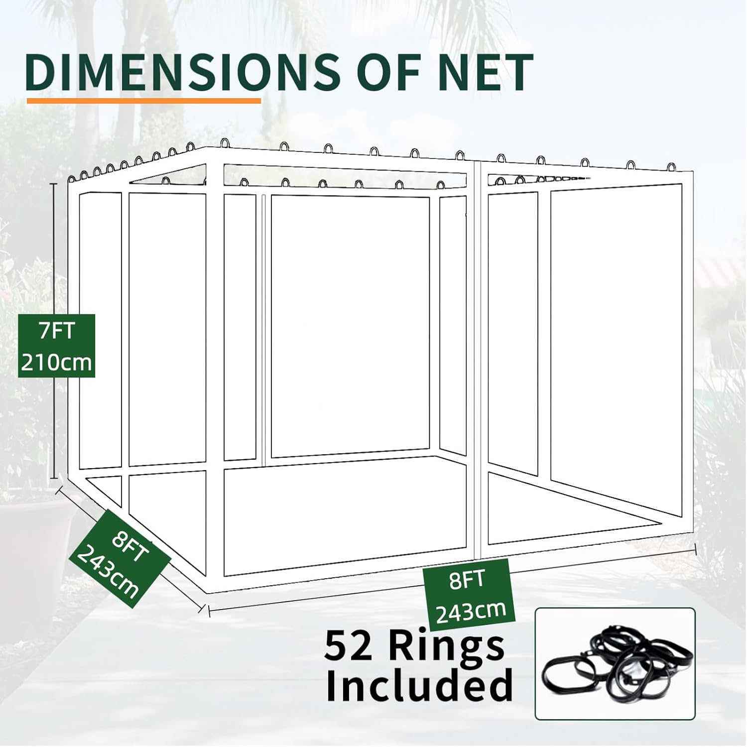 - 【Dimensions】(243cm x 243cm x 210cm) 8 ft (L) x 8 ft (W) x 7 ft (H) . Our universal mosquito netting fit most 8 x 8 feet gazebo or canopy. Please measure the size before ordering to ensure a proper fit.