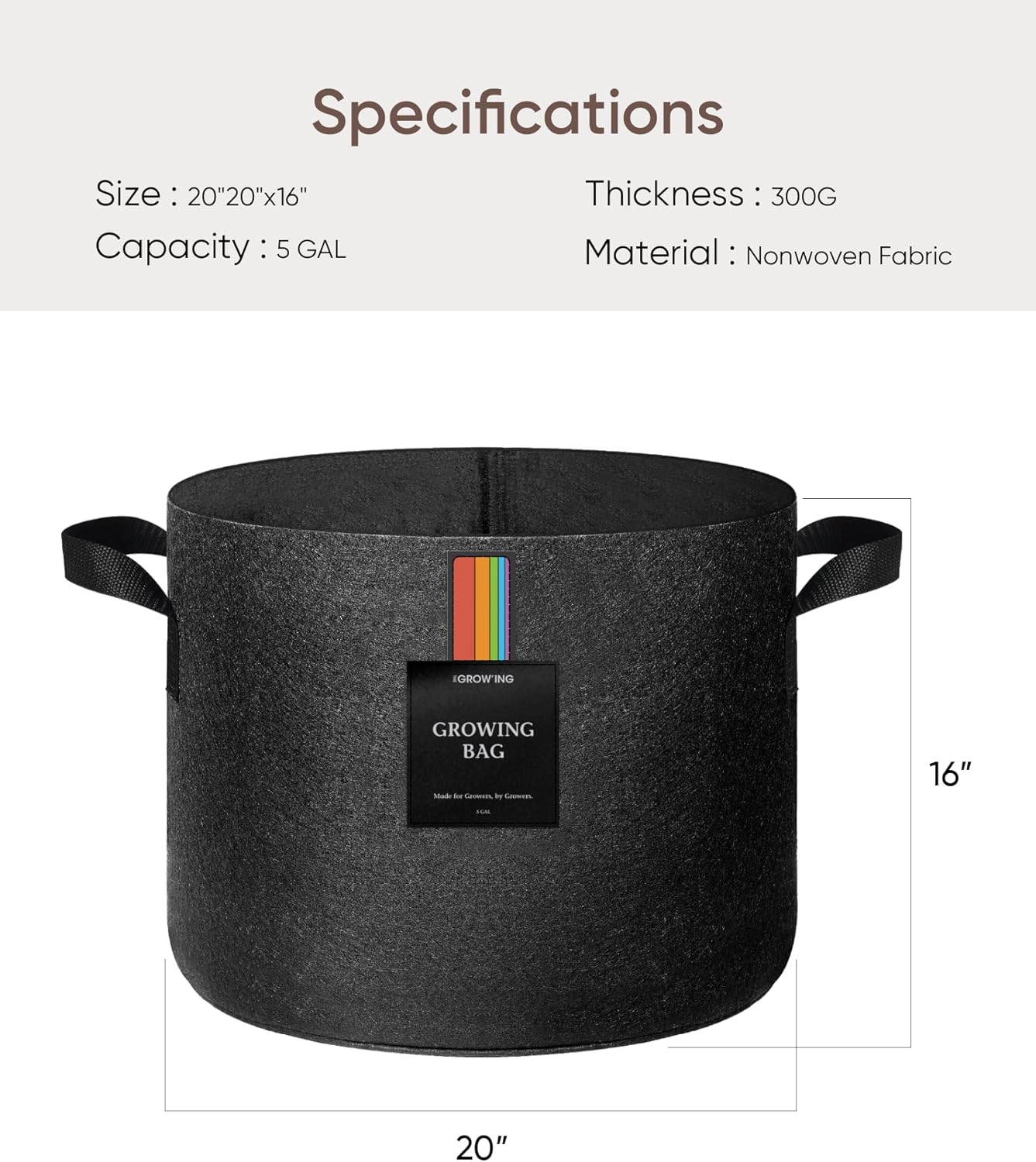 The Growing 5 Pack 20 Gallon Fabric Grow Bags,Thickened Aeration Nonwoven Fabric Plant Pots with Durable Handles,Heavy Duty 300G Planter Pot for Tomato, Fruits, Vegetables and Flowers, Black
