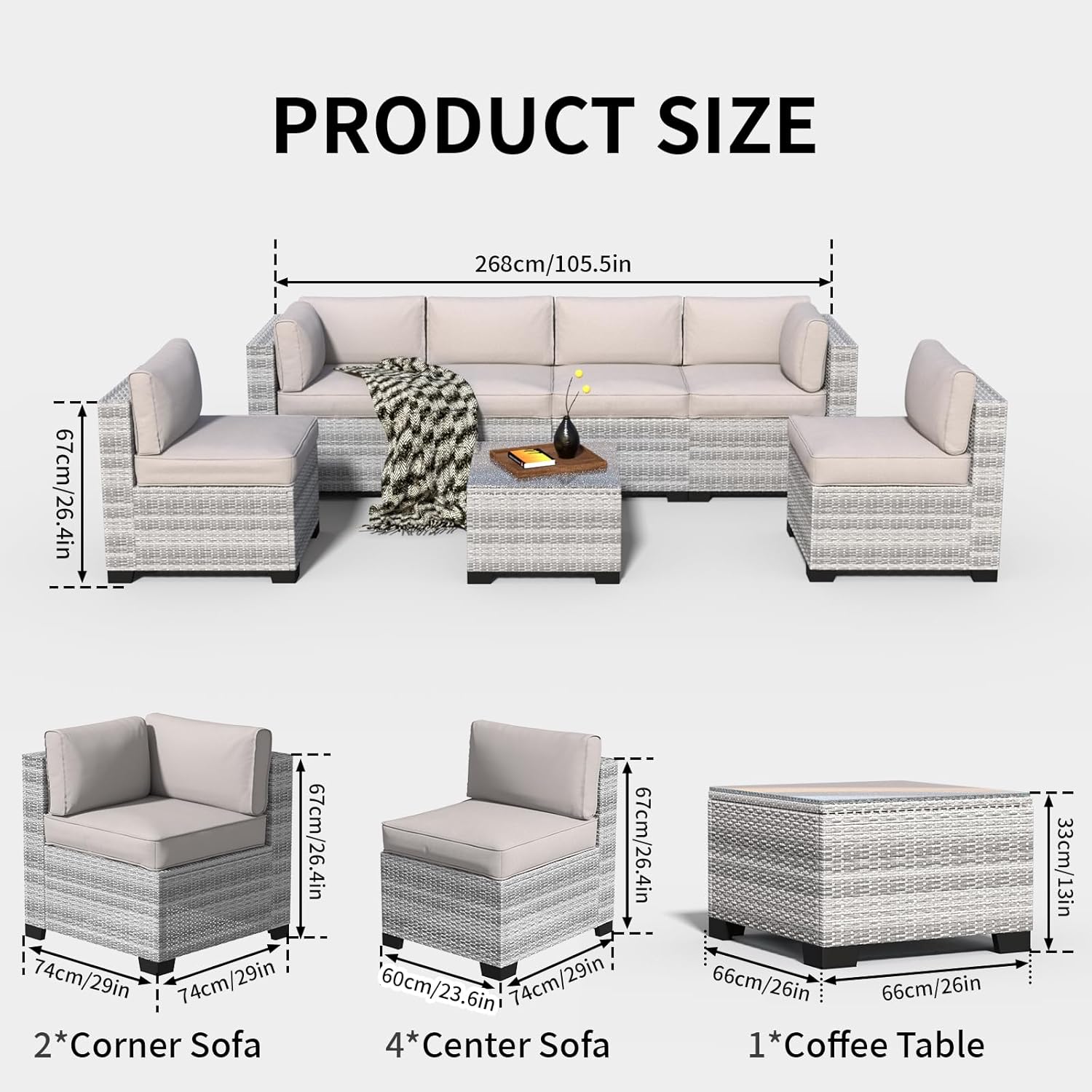 - 7-Piece Set: This patio set includes four center sofas, two corner sofas, and a functional coffee table. Whether you're hosting a gathering or enjoying a quiet moment outdoors, this set provides comfortable seating and a convenient surface for drinks, snacks, or decor