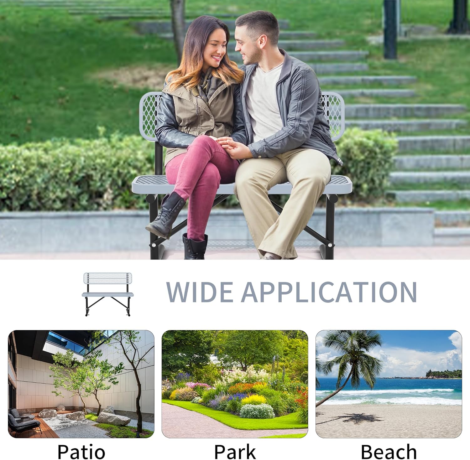 - Outdoor Park Bench: This portable outdoor bench is made of high-strength steel with an all-weather thermoplastic coating on the surface, super smooth, rust-proof & waterproof. It is suitable for various outdoor or indoor places, such as camp fields, park, courtyards, backyards, gardens, pool sides, and living rooms.