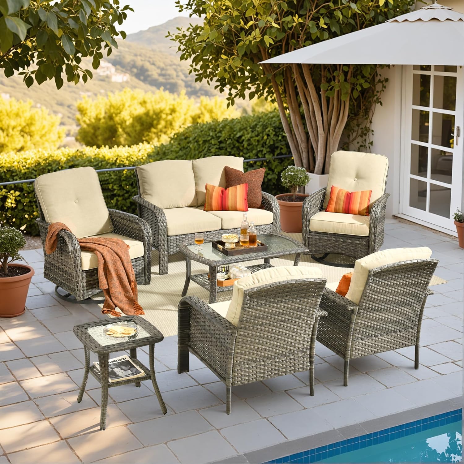 HOOOWOOO Patio Furniture Set,7 Pieces Outdoor Conversation Set,All Weather Wicker Loveseat Sofa Set with High Back Swivel Rocking Chairs Tables,Beige