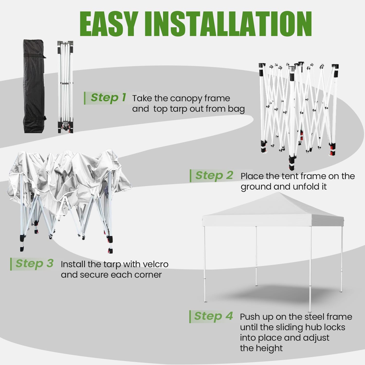 - Easy Up Canopy: This pop up tent can be assembled or packed in 5 minutes by its pop up design. Lightweight assembly design avoids the hassle of traditional tents, giving you more time to enjoy your activities. With three adjustable height settings, this canopy tent offers versatile options for any outdoor occasion, like camping or parties