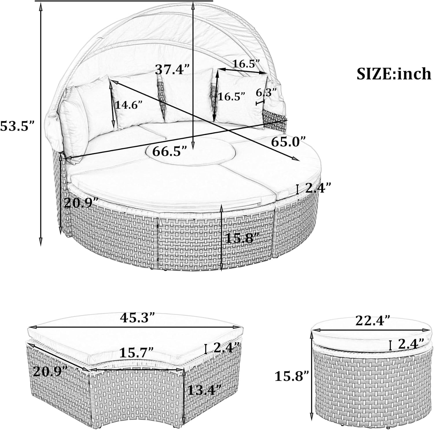 - 💗 Versatile Comfort with a Retractable Canopy: Our round sectional sofa, which seamlessly transforms into an organized daybed. The retractable canopy, easily fastened by straps, allows you to enjoy the sun or relax in the shade on your terms.