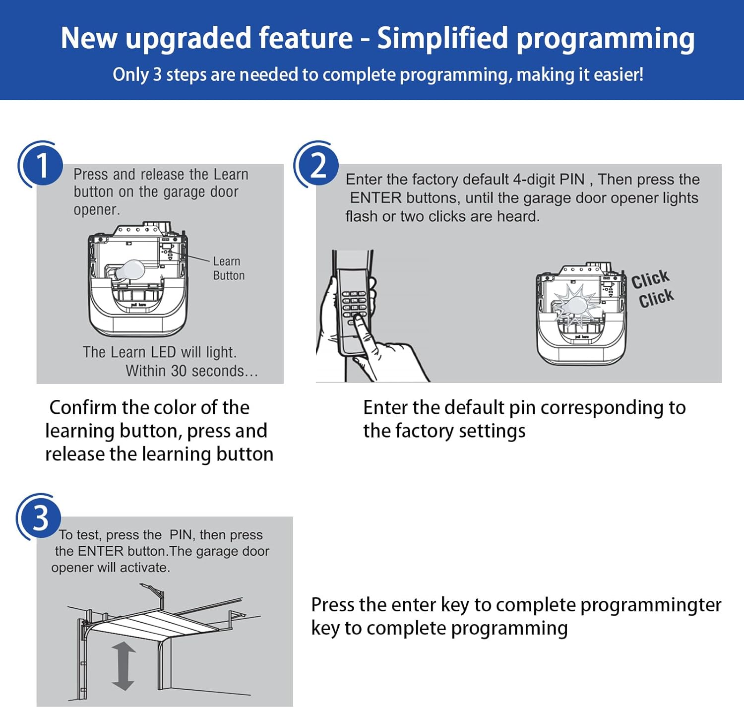 - 3.Upgrade to simpler programming: The garage door keypad programming can be completed in just 3 steps.You can set up a 4-pin in two minutes to pair it with the garage door opener.The keyless entry system can control up to 3 openers, and different PIN codes can match and control different garage door remote receivers.