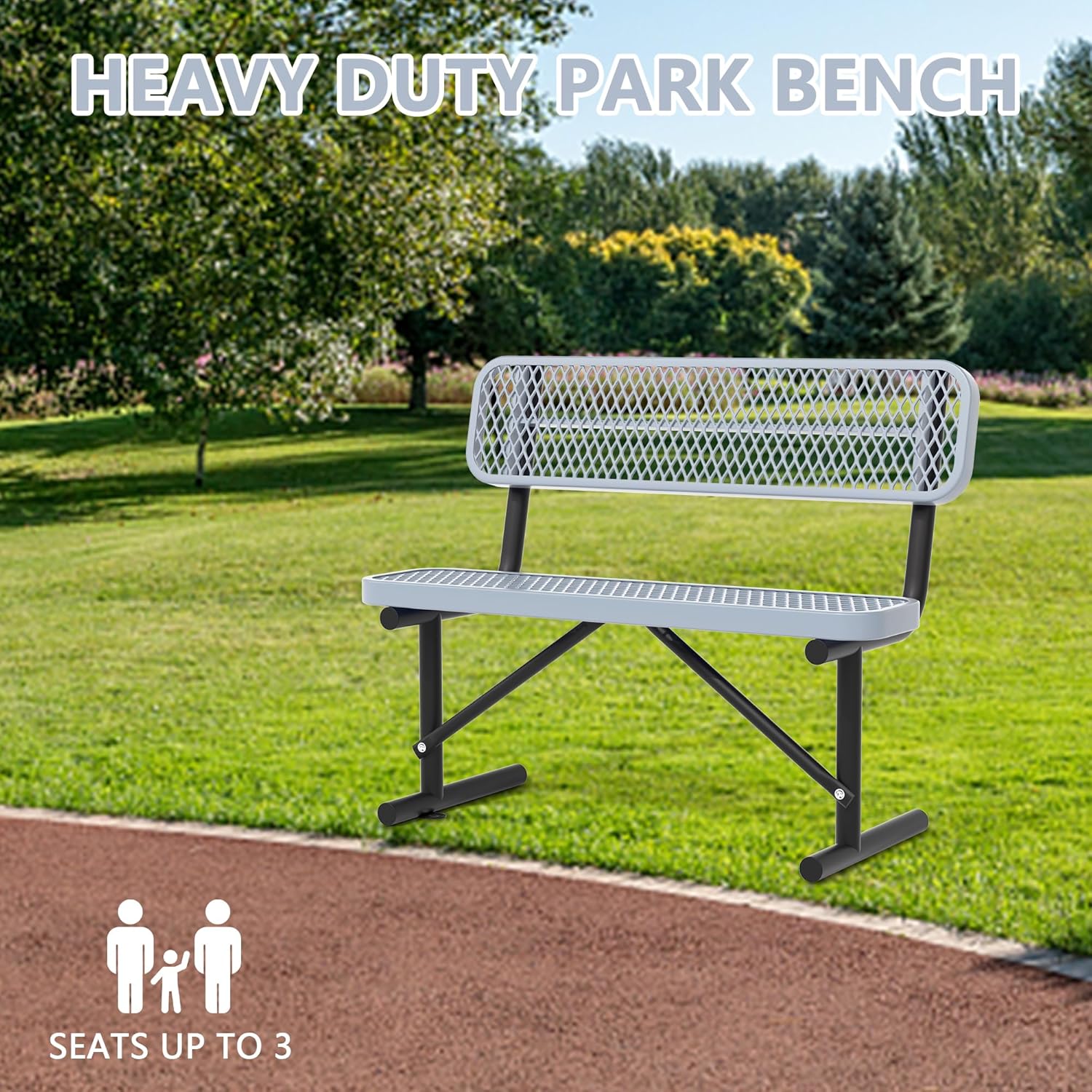 Heavy Duty Park Bench with Back Portable Frame, Outdoor Steel Bench with Backrest, Outdoor Park Bench Expanded Metal Mesh Bench for Lawn, Park, Deck, Garden, Patio, Porch, Black (Gray, 4FT)