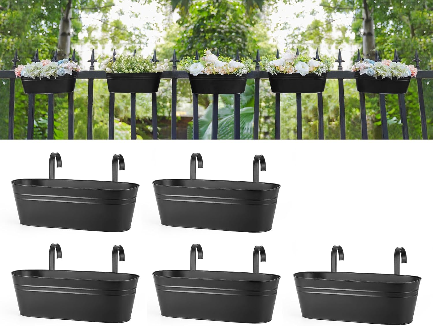 Dahey 5 Pcs Metal Iron Hanging Flower Pots for Railing Fence 15.7 Inch Hanging Bucket Pots Countryside Style Window Flower Plant Holder with Detachable Hooks for Garden Yard Home Decor, Black