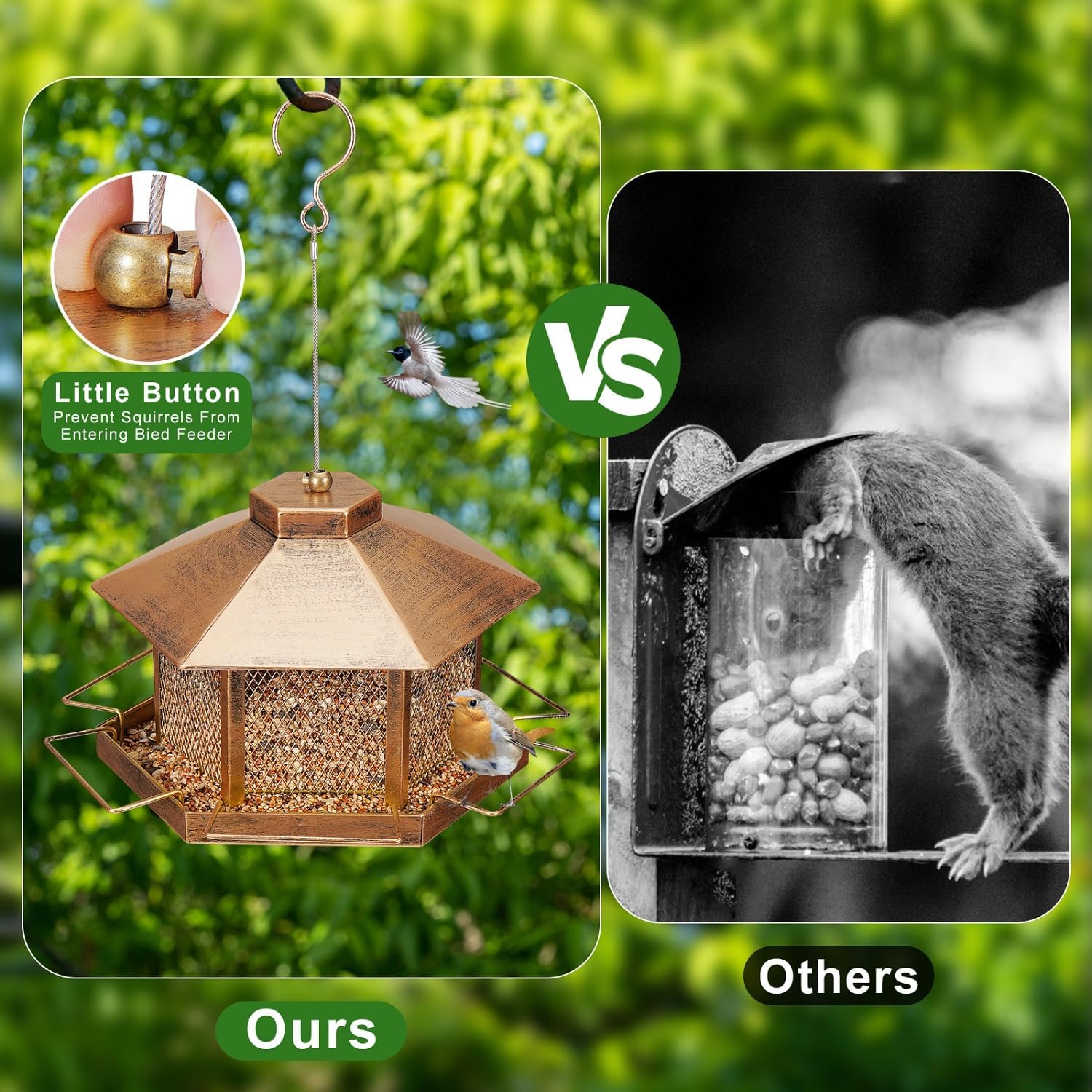 - SQUIRREL-PROOF & WEATHER-RESISTANT Unlike flimsy plastic feeders, the DTEPFUEN bird feeder is made of heavy-duty metal to withstand squirrel damage and harsh weather. The metal roof and perches prevent squirrels from chewing through, while the powder-coated finish resists rust, ensuring long-lasting use outdoors.