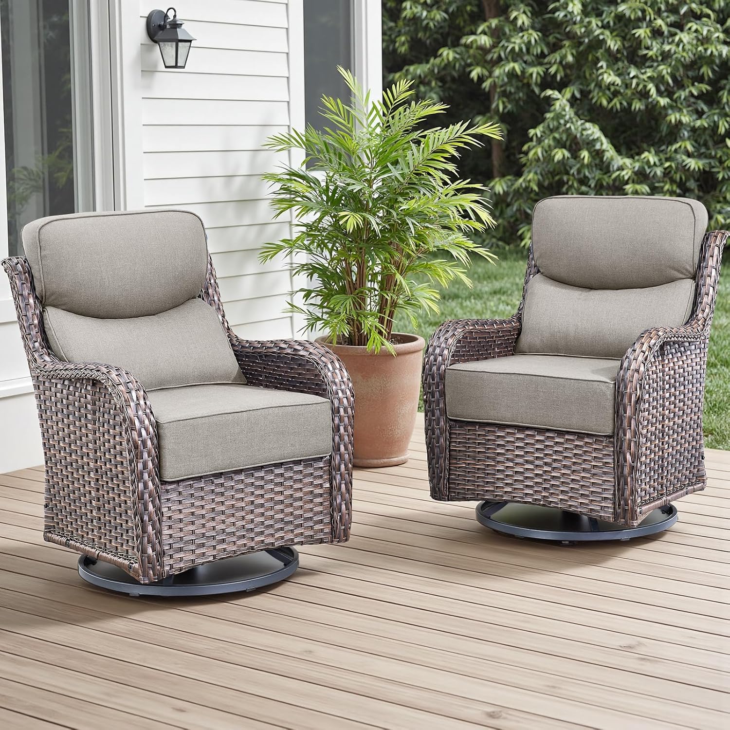 Outdoor Patio Swivel Rocker Chairs Set of 2, Waterproof Wicker, High Back, Deep Seating, Wide Armrest, Upgraded 6 inch Thick Cushions, Ideal for Deck Porch Backyard, Brown/Beige