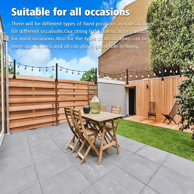 - No height restrictions:Made of high quality metal, it will not bend or wobble. The poles for string lights is not limited by its own length, and the excellent load-bearing properties allow you to install it on high fences and walls. Get rid of the general height limitation. You can also hang more number of strings of lights. Also can be applied to banners, lanterns, wind chimes, all kinds of light decoration, etc.