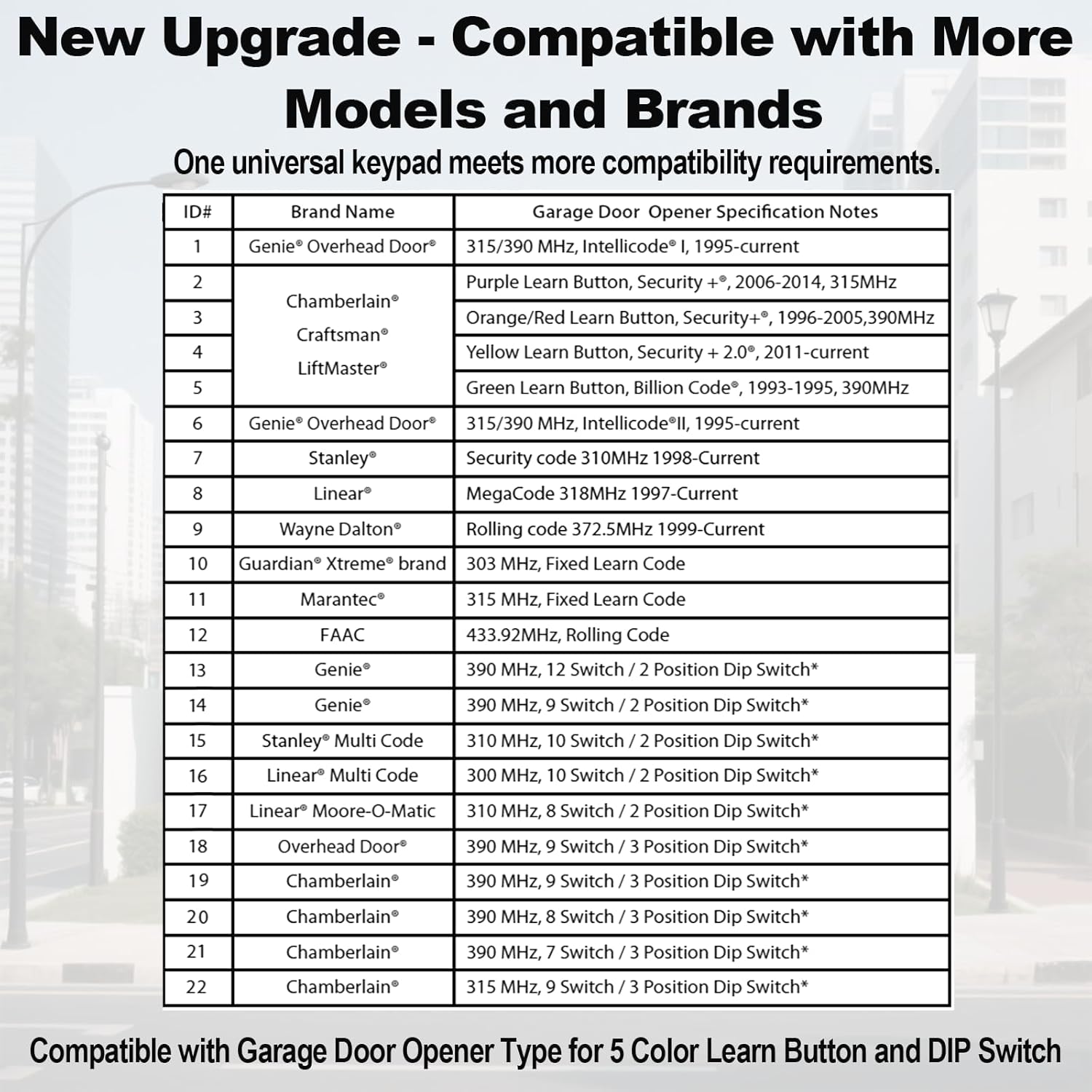 - 1.Universal compatibility:This universal garage door opener keypad is compatible with Genie/Liftmaster/Chamberlain/Craftsman/Linear/Wayne/Stanley/Genie Overhead Door garage door opener.Both Compatible with Smart Learn Button and DIP Switch.Please refer to the detailed image for the specific model.