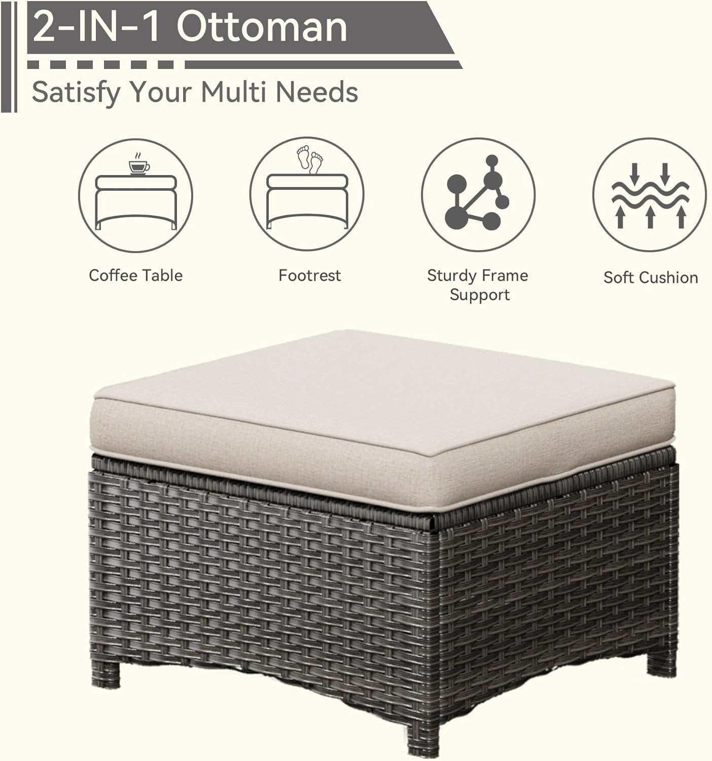 5 Pieces Patio Conversation Set, Wicker Chairs Set of 2 and Two Ottomans with 3.5-inch Seat Cushions, 1 Side Table High Back and Curved Armrest for Backyard, Balcony and Deck, Beige