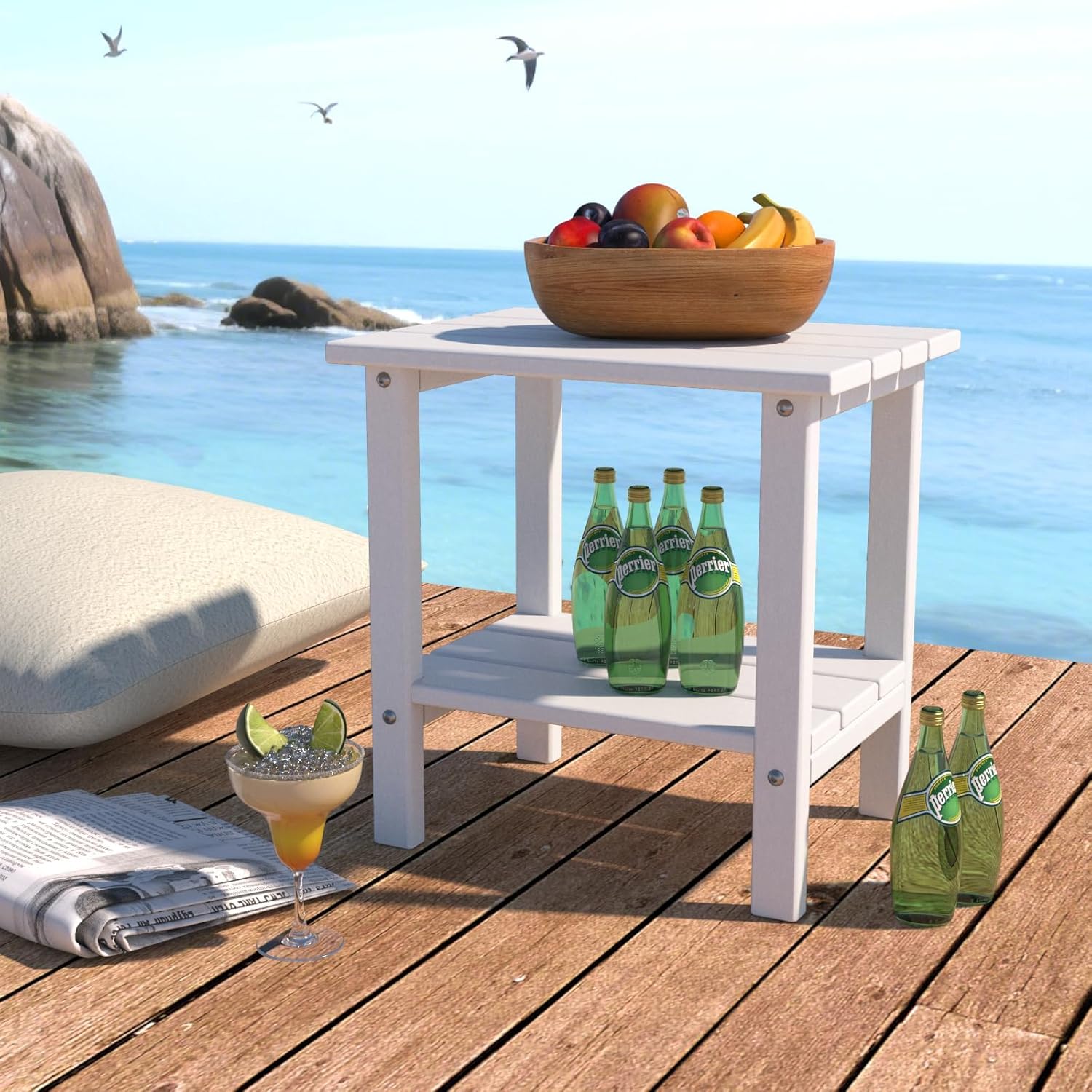 Outdoor Adirondack Side Table, 2-Tier Storage Patio Side Table, Weather Resistant Patio End Table for Backyard & Pool, Durable HDPE Small Outdoor Table (White)