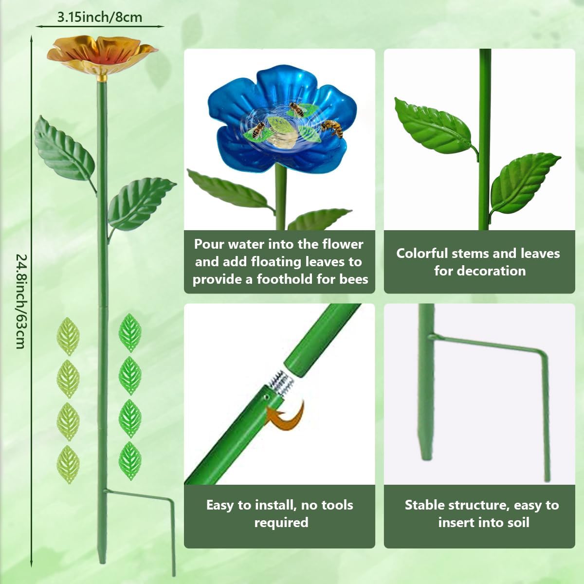 - 【Easy to Use】Bee watering station with feeder adopts a detachable design and is easy to use. You only need to fix the base in the soil and the flowers on the bracket. Pour clean water into the flowers and put in floating leaves. Be careful not to make the water level too deep.