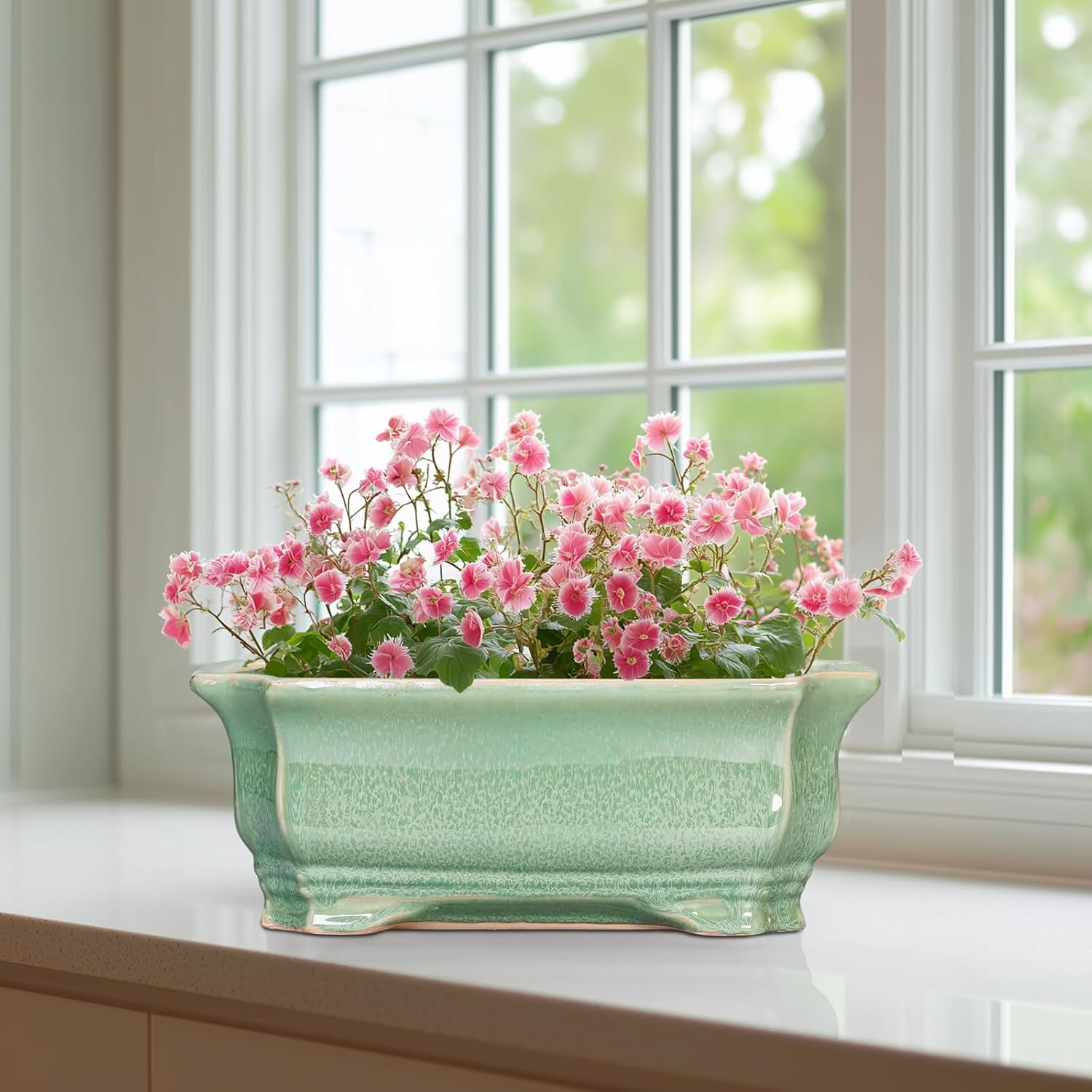 Bonsai Tree Pot 11.6 Inch - Ceramic Succulent Pots, Bonsai Planter for Indoor Outdoor, Decorative Plant Pot with Drainage Hole, Rectangular Flower Pot, Home Garden Decor, Garden Gifts, Green