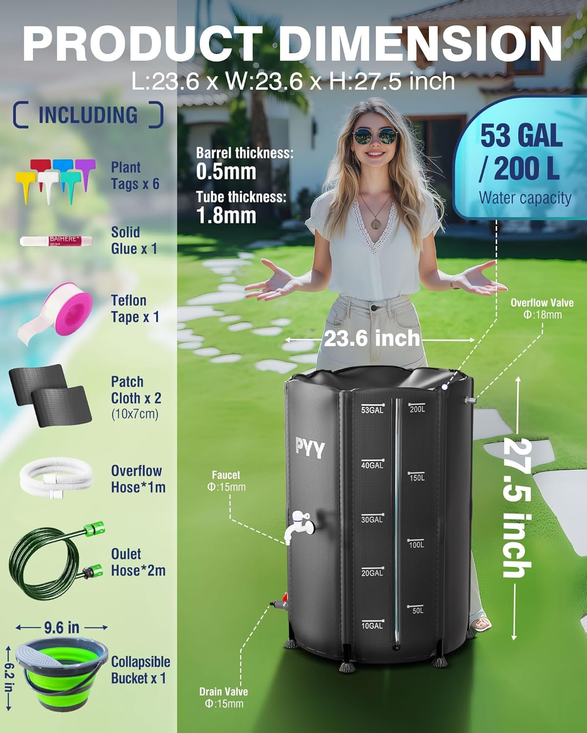 PYY Rain Water Collection Barrel - 53 Gallon Black Water Storage Tank with Spigot, Hose and Portable Bucket, Large Plastic Collapsible Rain Catcher Catchment System to Collect Rainwater from Gutter