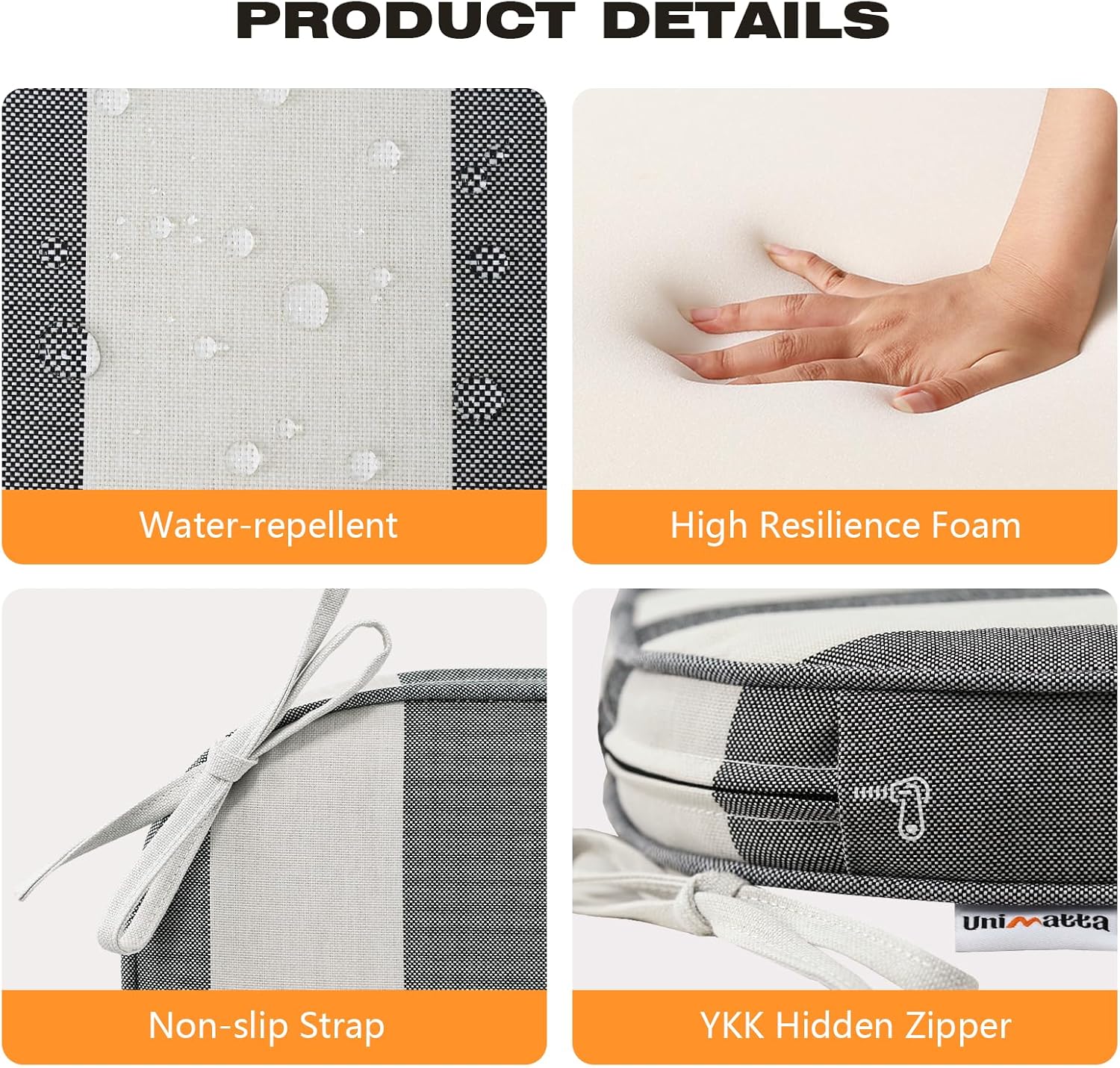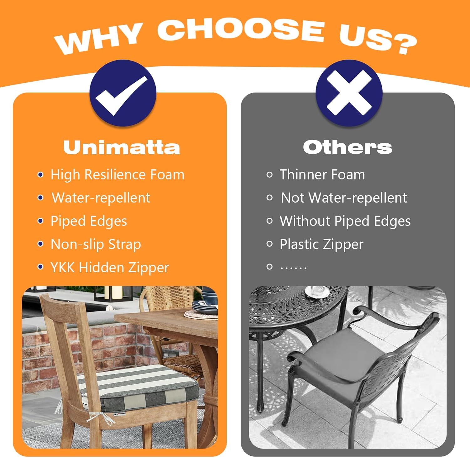 - 【High Resilience Foam】 The Unimatta chair cushions are filled with high-quality 100% foam, high-density sponge offers excellent support and long-lasing comfort. Whether you're enjoying a sunny afternoon or a cool evening, this cushion will keep you cozy.