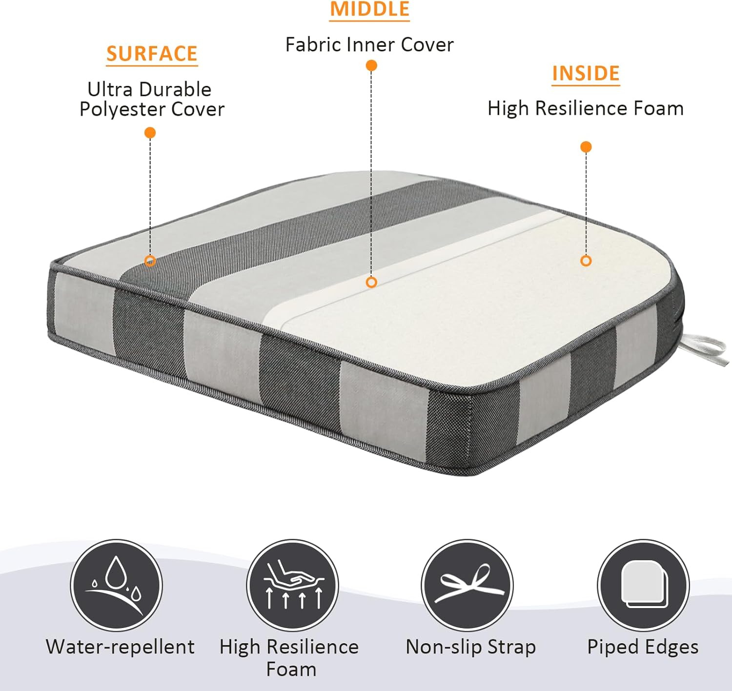 Round Corner Seat Cushions, 17" x 16" x 2", Set of 4, Indoor Outdoor Water Repellent Universal Chair Pads with Ties for Patio Furniture, Garden Deck Dining Chairs, Gray Stripe