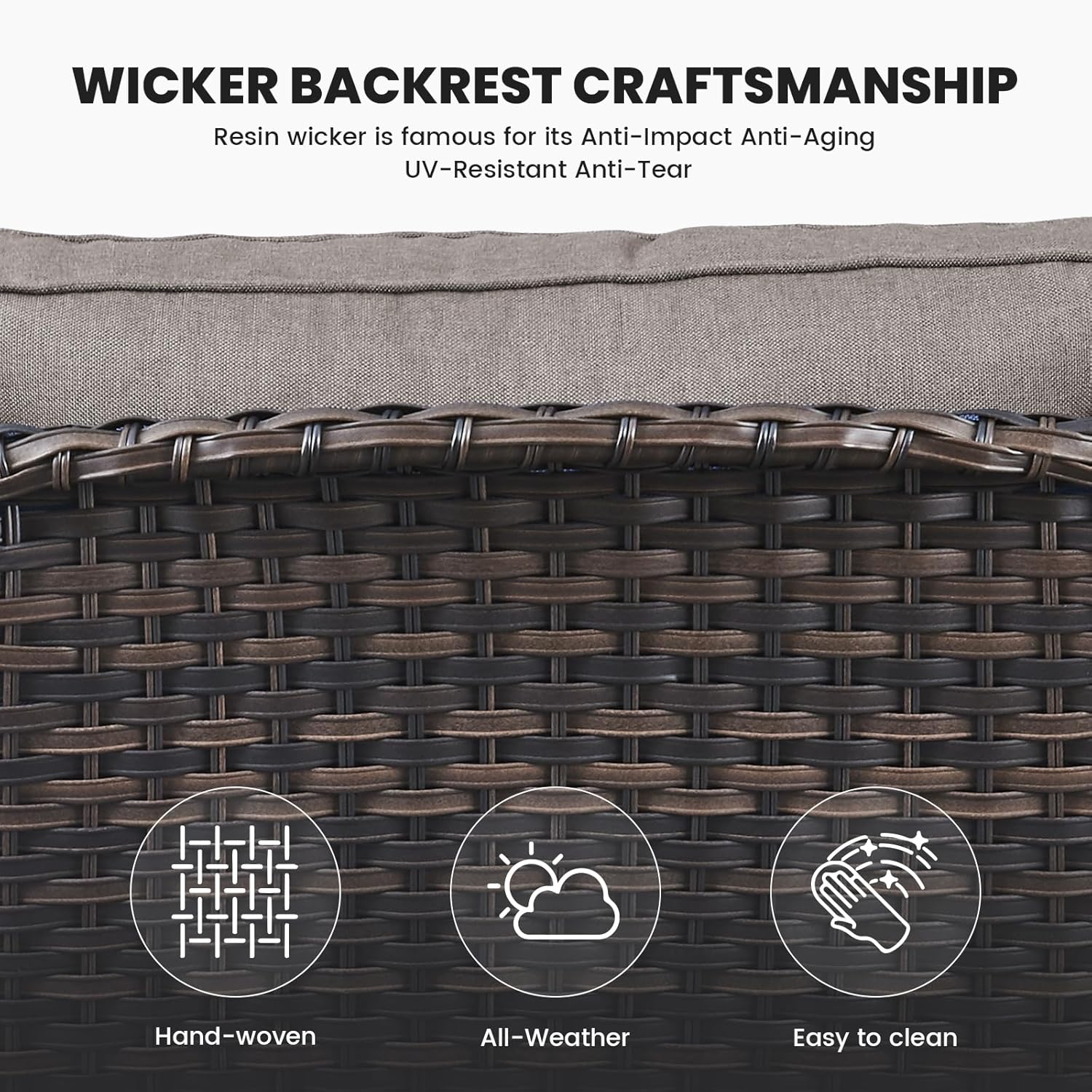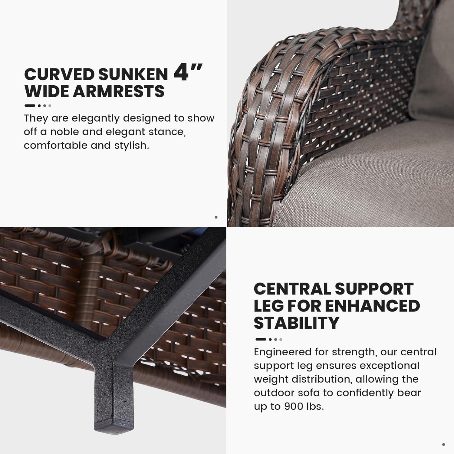 - 3.Durable Material: This outdoor wicker sofa is made of hand-woven weather-resistant PE rattan and powder-coated steel frame, which makes the sofa couch stronger and more durable. The wicker sofa can hold up to 900 pounds of weight capacity.