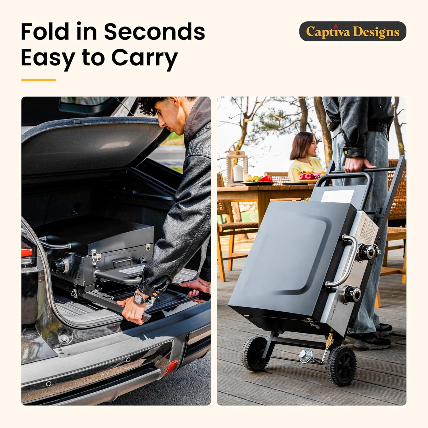 - 𝐏𝐨𝐫𝐭𝐚𝐛𝐥𝐞 𝐅𝐥𝐚𝐭 𝐓𝐨𝐩 𝐆𝐫𝐢𝐥𝐥: Our portable gas griddle grill comes with a wheeled stand and a built-in handle, making it easy to move around. The stand is foldable, and when folded, it is about the size of a standard suitcase, allowing it to fit easily in a car trunk without taking up too much space. It's an ideal choice for camping and tailgate parties.