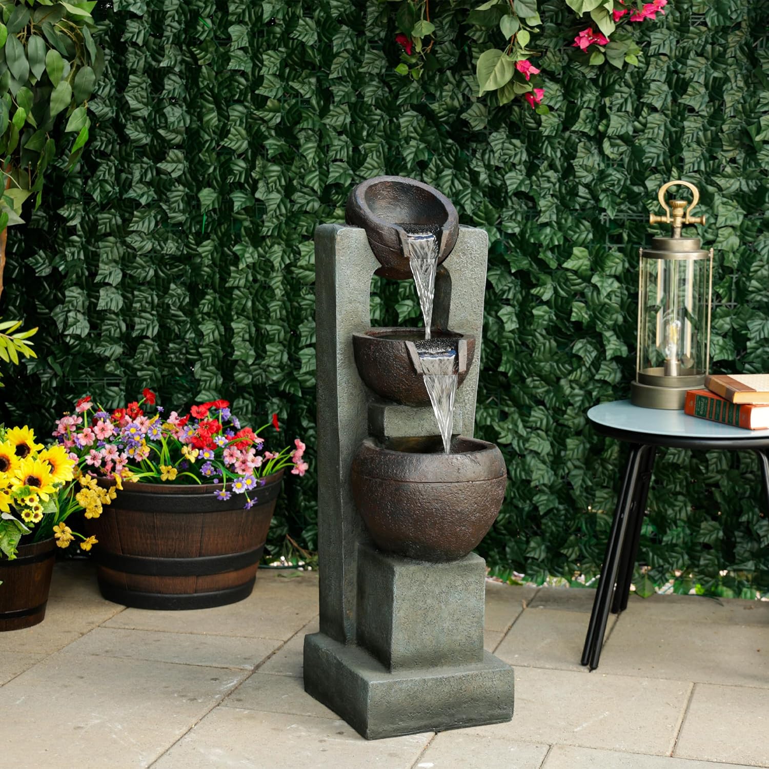 - 34" 3 TIER BASIN CASCADING FOUNTAIN – This elegant 3-tier basin design creates a peaceful cascade of water, flowing gracefully from one level to the next, adding tranquility and charm to your garden, patio, yard, or any outdoor space for an inviting atmosphere.