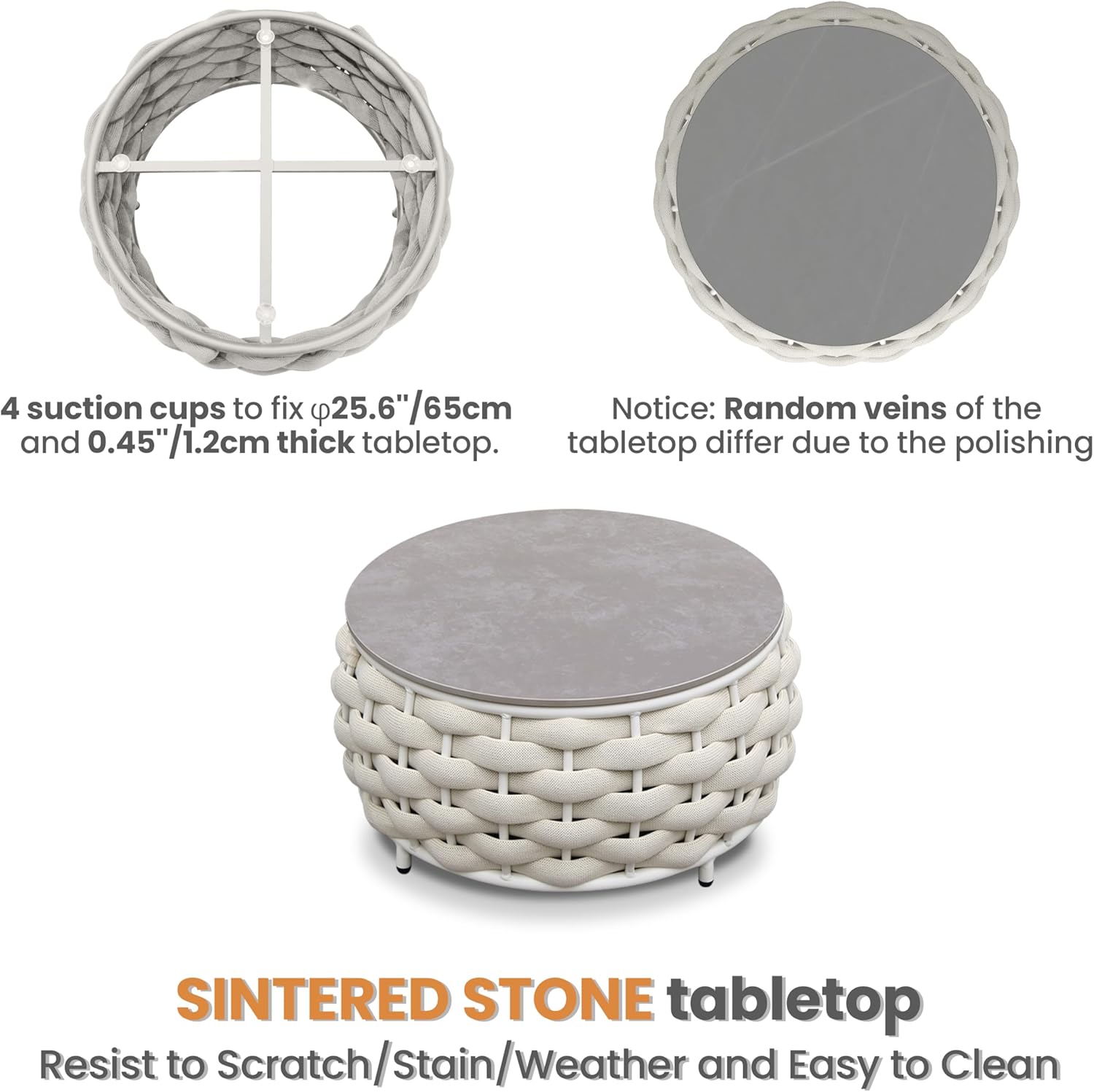 - Easy cleaning and scratch-resistant sintered stone tabletop is fixed by 4 suction cups. Cushions covers replaceable removal and machine washable. Accent sofa relaxation set equipped with adjustable nylon feet levelers for uneven floor also prevent scratching