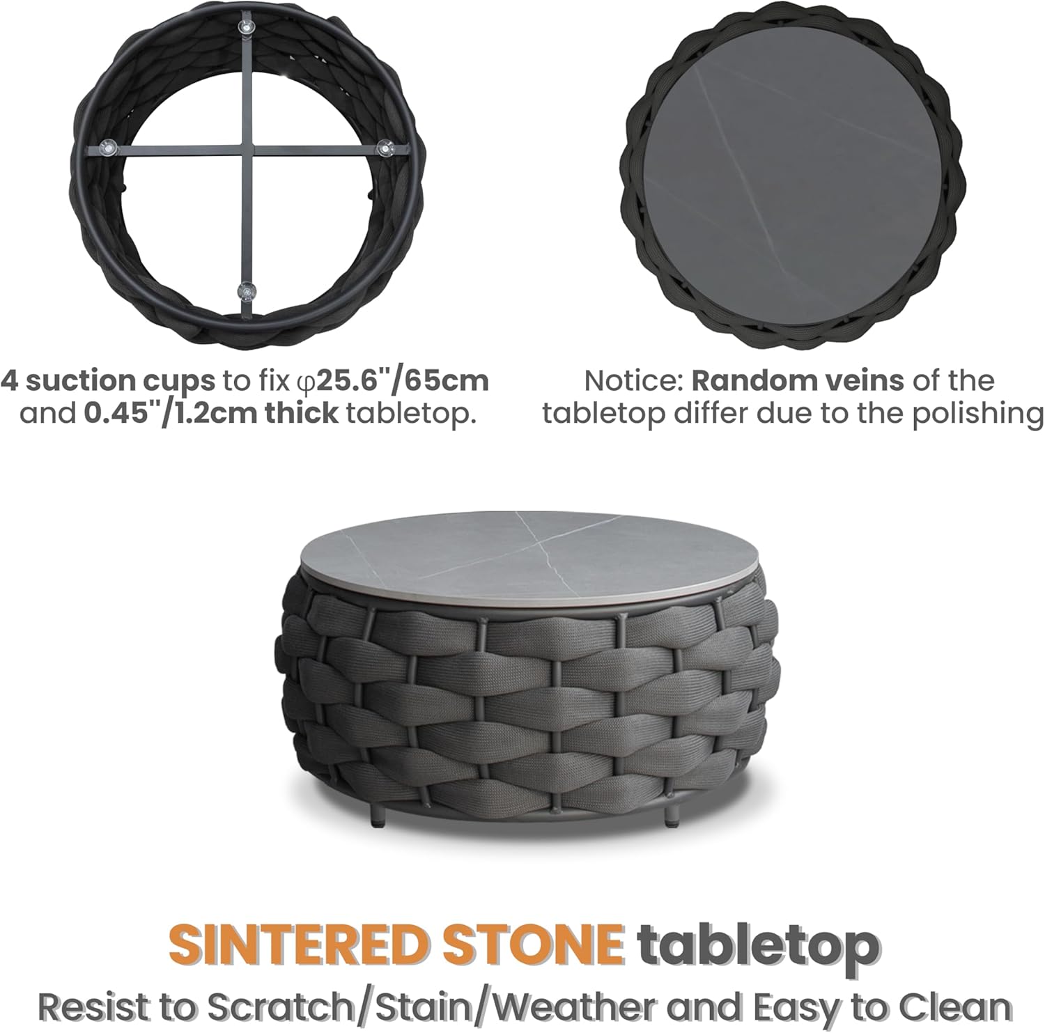 - Easy cleaning and scratch-resistant sintered stone tabletop is fixed by 4 suction cups. Cushions covers replaceable removal and machine washable. Accent sofa relaxation set equipped with adjustable nylon feet levelers for uneven floor also prevent scratching