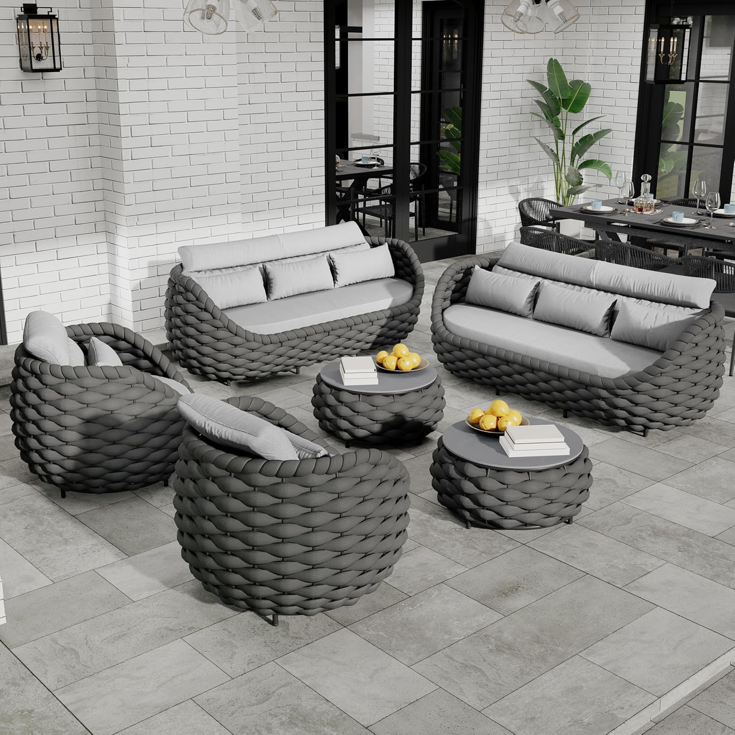 - Woven rope sofa set includes: 2*armchairs, 2*3-seater sofas, 2*coffee tables. Size: Single chair: 34.3''(L)X34.3''(W)X27.6''(H) holds up to 400 lbs/181.5kg; 3-seater couch: 71.5''(L)X34.7''(W)X27.6''(H) holds up to 1200lbs/545kg; Side table: 28.4''(L)X28.4''(W)X14.2''(H) holds up to 176 lbs/80kg. Color: Dark gray rope and gray fabric