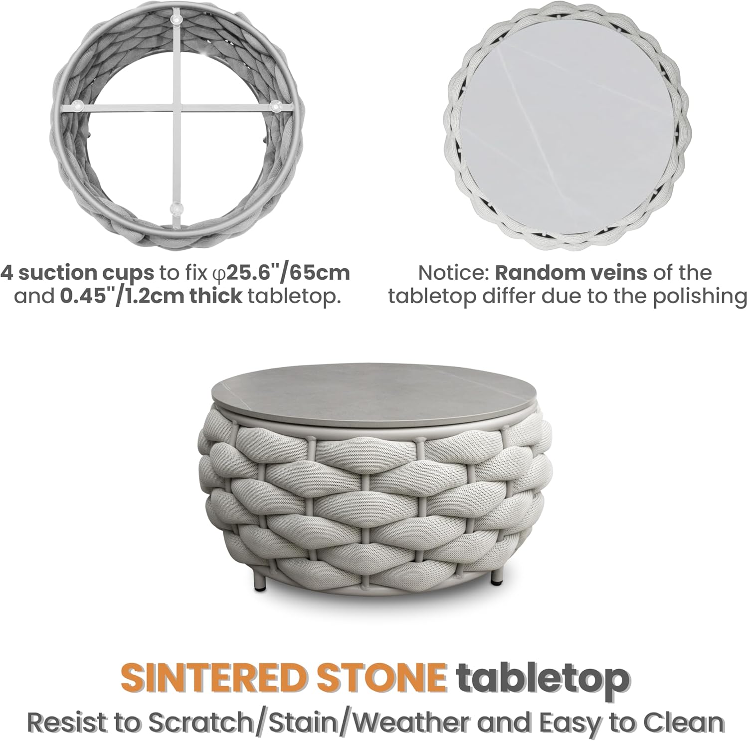 - Easy cleaning and scratch-resistant sintered stone tabletop is fixed by 4 suction cups. Cushions covers replaceable removal and machine washable. Accent sofa relaxation set equipped with adjustable nylon feet levelers for uneven floor also prevent scratching