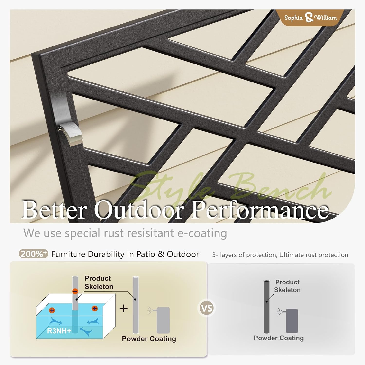 - Superior Material: The outdoor bench is made of Cast Iron to ensure sturdiness and stability, making it heavy-duty oriented and durable enough for long-term use. The surface comes with special e-coating for rust resistance and weather resistance, all edges are finished, super smooth and no raw cuts or drips to catch on clothing