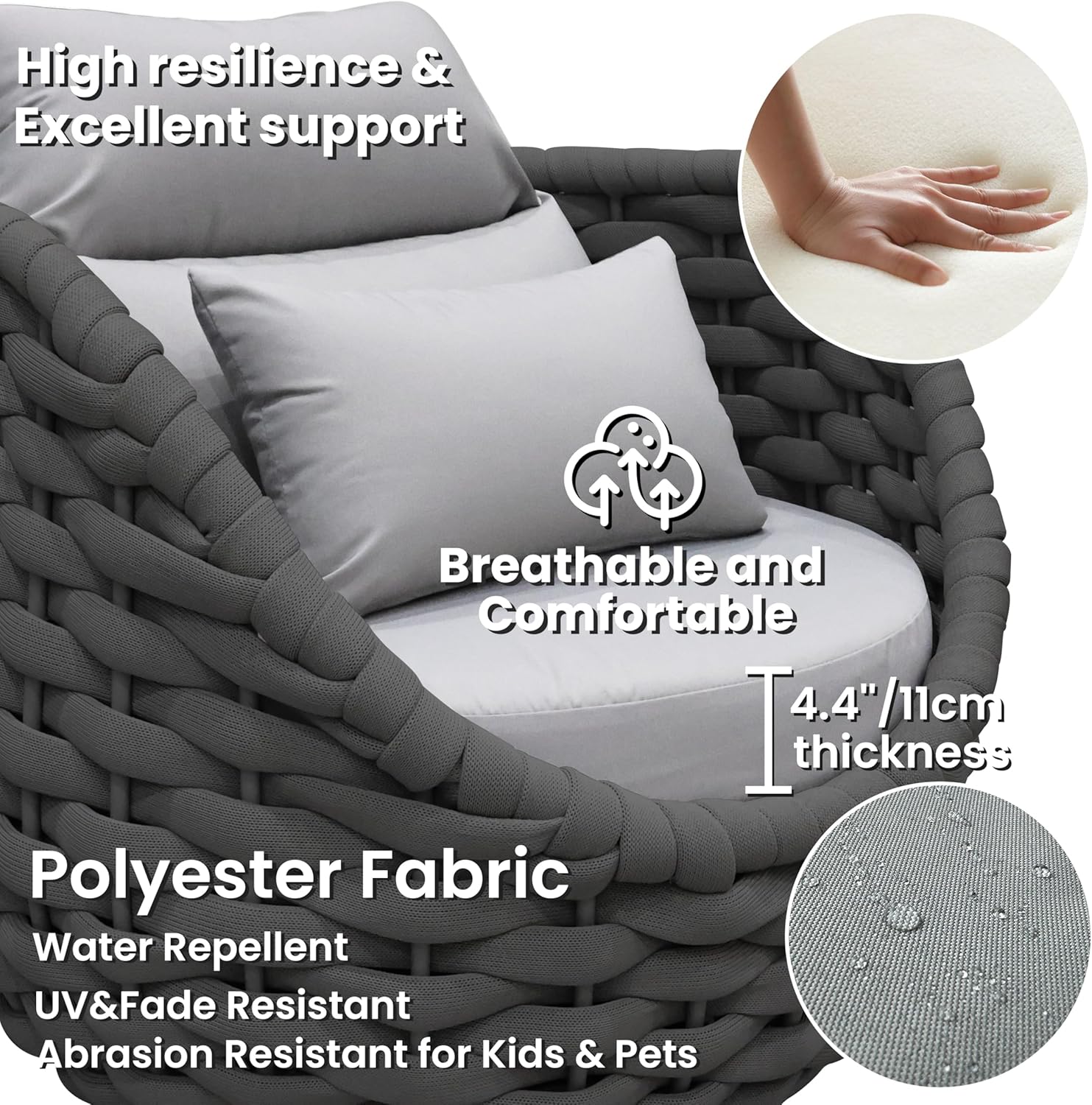 - Filled with 4.3"/11cm thick high-density sponge and cotton, cushions are soft touching and breathable for a refresh comfy patio seating holding its shape in long time using. Water repellent and abrasion resistant polyester fabric also fits families with kids and pets