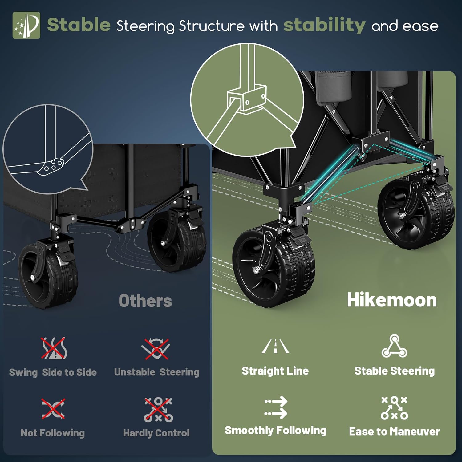 - ใ๐๐๐ญ๐๐ง๐ญ๐๐ ๐๐ญ๐๐๐ฅ๐ ๐๐ญ๐๐๐ซ๐ข๐ง๐ ๐๐ญ๐ซ๐ฎ๐๐ญ๐ฎ๐ซ๐ & ๐๐๐ฃ๐ฎ๐ฌ๐ญ๐๐๐ฅ๐ ๐๐๐ง๐๐ฅ๐ ๐ ๐จ๐ฅ๐๐๐๐ฅ๐ ๐๐๐ ๐จ๐ง ๐๐๐ซ๐ญ๐ฌใ: The upgraded stable steering structure ensures the folding wagon moves in a straight line without swaying or wheel collision. The handle can be rotated 90ยฐ forward and backward, making it easier for people of different heights to use. The rebound function keeps the handle upright, so you donโt have to bend over to reach it. These designs make the wagon easy, stable, and maneuverable to pull and steer.