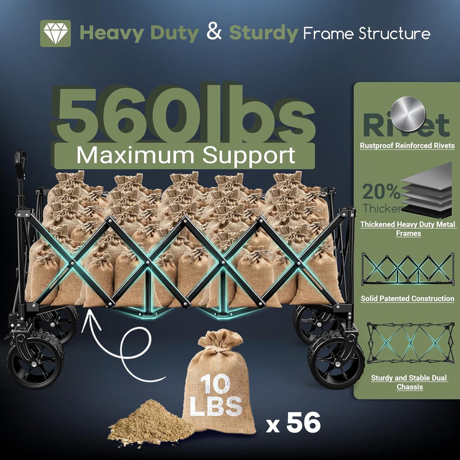 - ใ๐๐๐๐๐ ๐๐๐ซ๐ ๐๐ซ ๐๐๐ข๐ ๐ก๐ญ ๐๐๐ฉ๐๐๐ข๐ญ๐ฒ ๐๐ญ๐ฎ๐ซ๐๐ฒ ๐๐๐๐ฏ๐ฒ ๐๐ฎ๐ญ๐ฒ ๐๐๐ญ๐๐ฅ ๐ ๐ซ๐๐ฆ๐ ๐ ๐จ๐ฅ๐๐ข๐ง๐ ๐๐๐ซ๐ญใ: The reinforced heavy-duty metal frames give this premium collapsible wagon a static weight capacity of up to 560 LB and a dynamic weight capacity of up to 440 LB, making it more robust and resistant to buckling or deformation. The foldable utility cart can easily transport camping gear, garden tools, beach chairs, and groceries. It features 600D Oxford fabric that is tear-resistant, long-lasting, waterproof, and easy to clean.