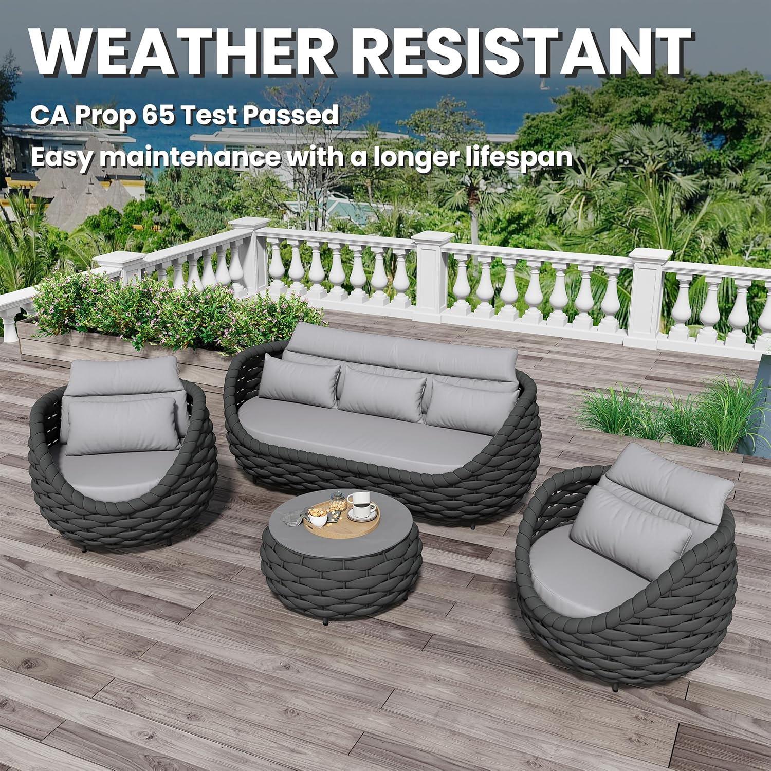 - Furniture set is crafted from reinforced rust-free aluminum alloy frame, wrapped in hand woven polyester rope. The 4 pieces all weather patio upholstered conversation set resists to UV, rain, wind, salt water. Perfect for indoor outdoor even arid or coastal areas