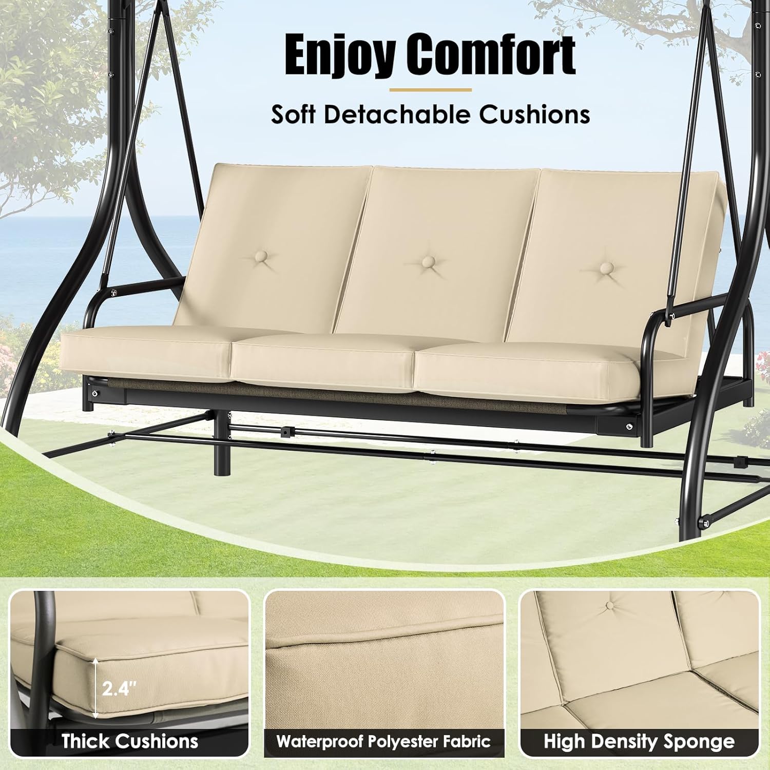 MAMIZO 3-Seat Patio Swing with Adjustable Canopy & Backrest, Outdoor Porch Swing Chair for Adults, Outside Porch Converting Bed Thickened Removable Cushions, 2mm Steel Pipe, for Garden, 750LBS (Beige)